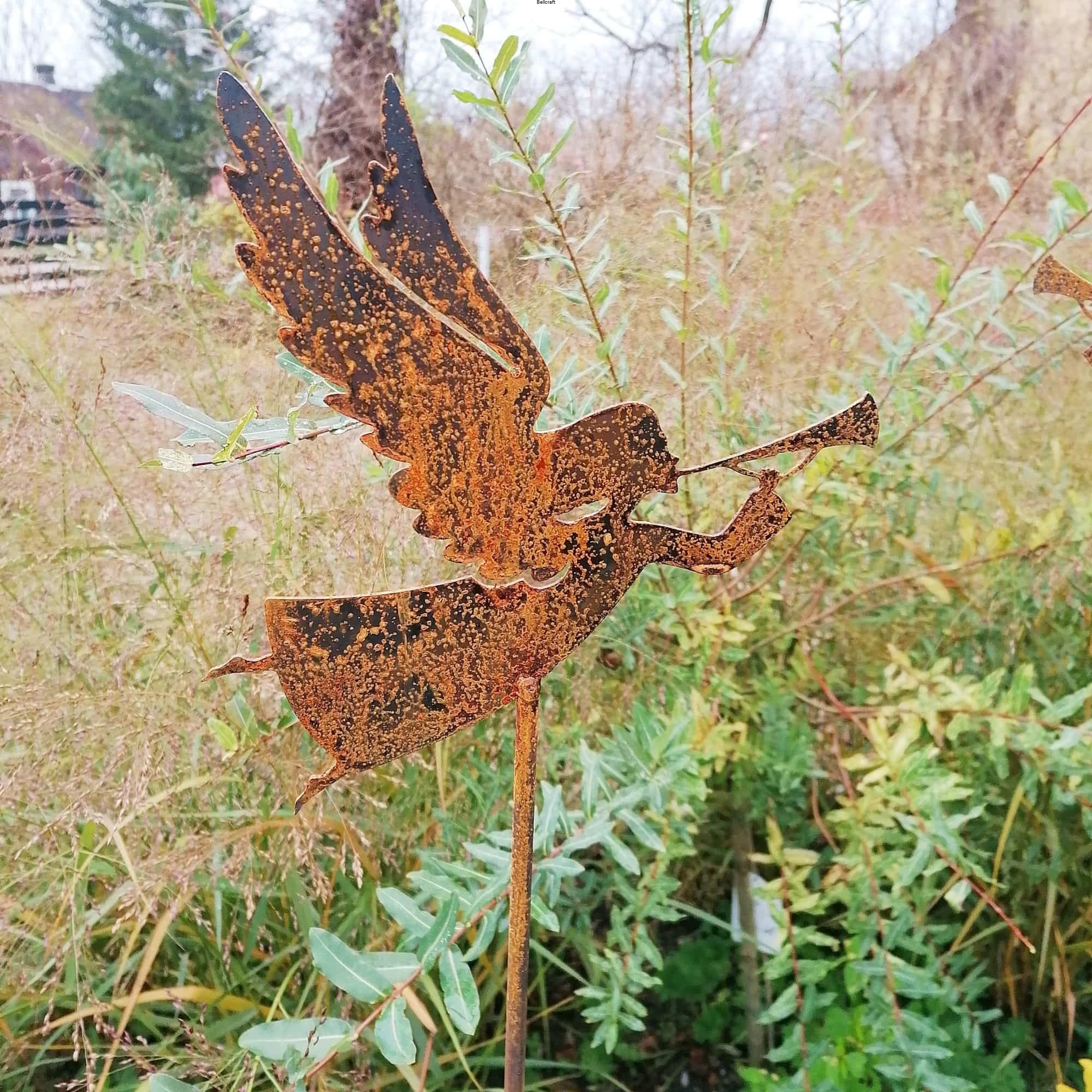 Zestaw 3 sztuk pięknych metalowych dekoracji ogrodowych w formie aniołów, na wysokim pręcie. Idealne do udekorowania ogrodu w okresie zimowym, zwłaszcza w czasie Świąt Bożego Narodzenia. Anioły najlepiej będą się prezentowały w przedogródku, wśród zasuszonych kęp ozdobnych traw, bądź też w towarzystwie zielonych iglaków.