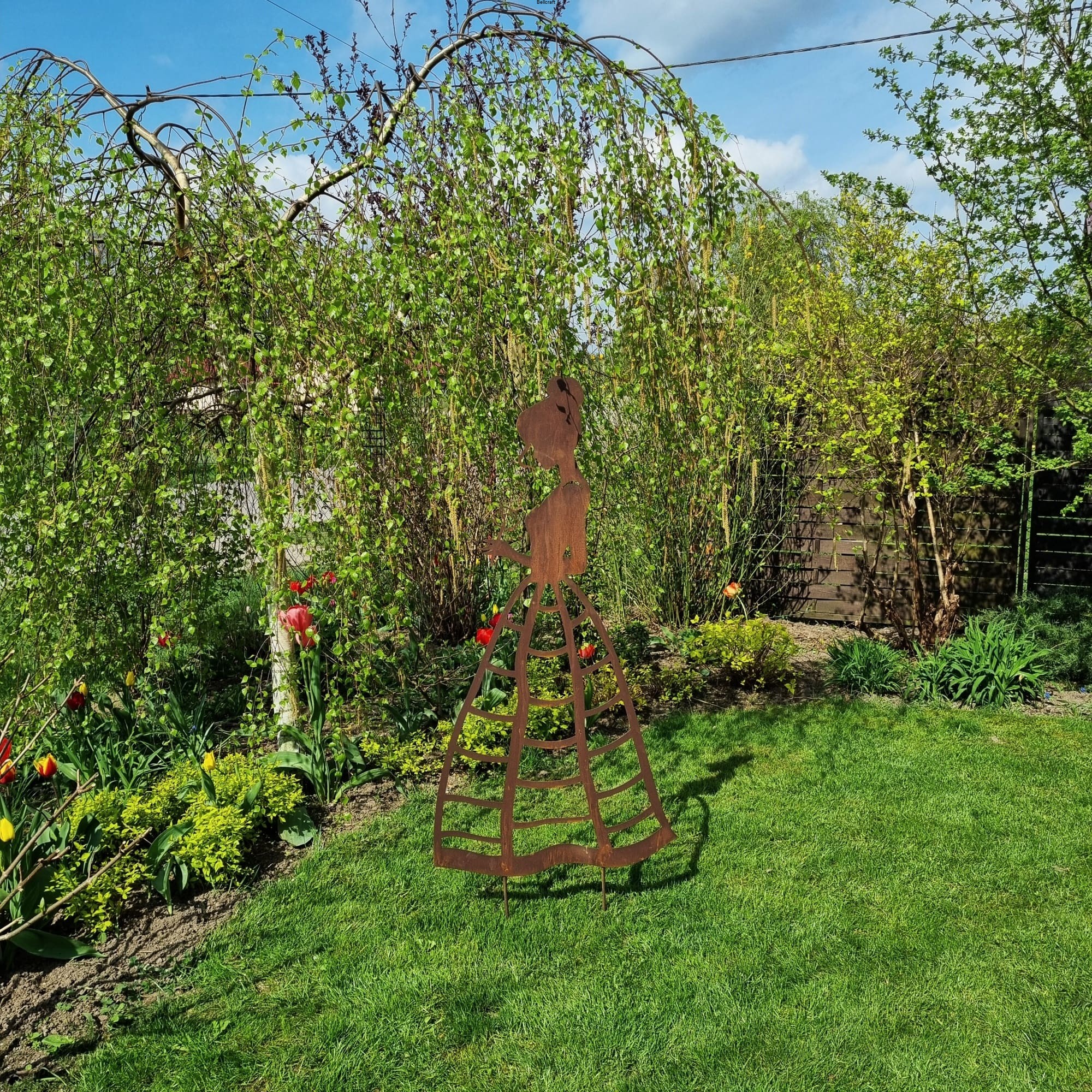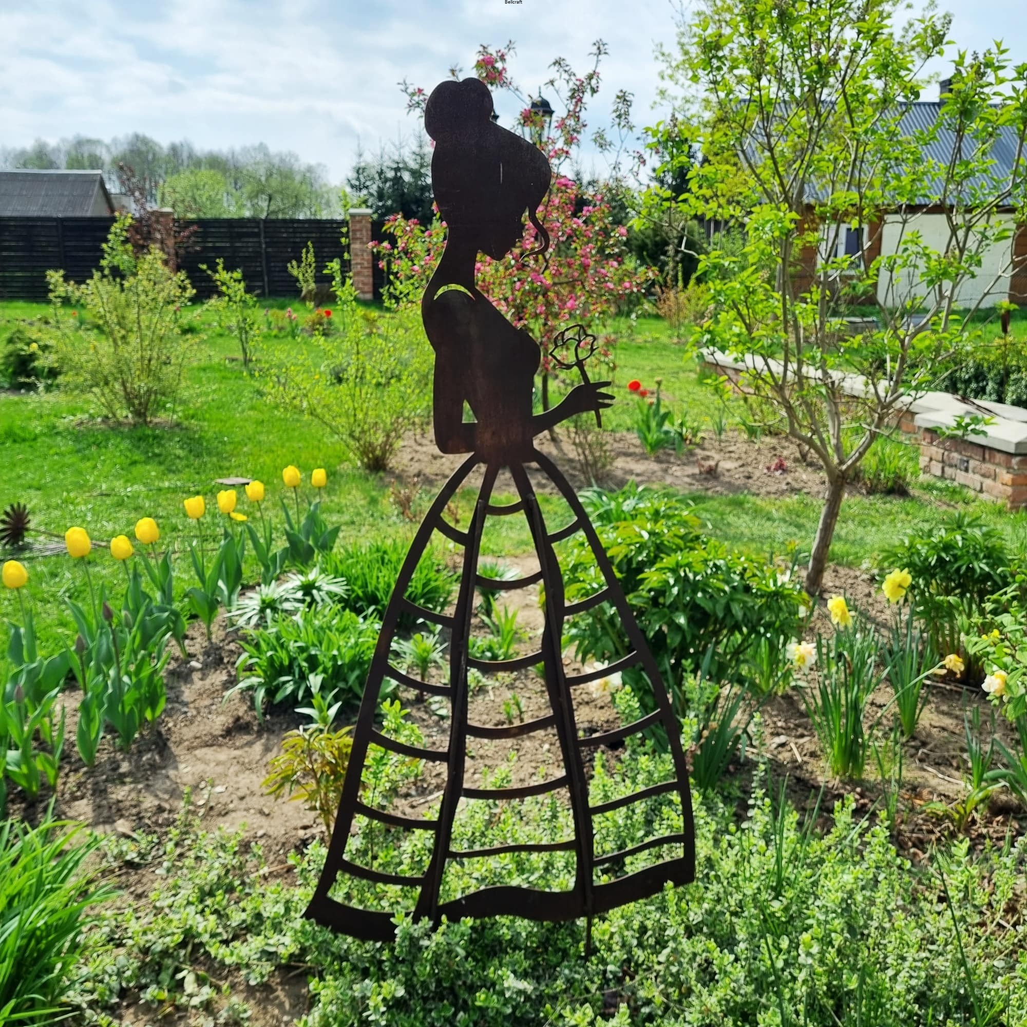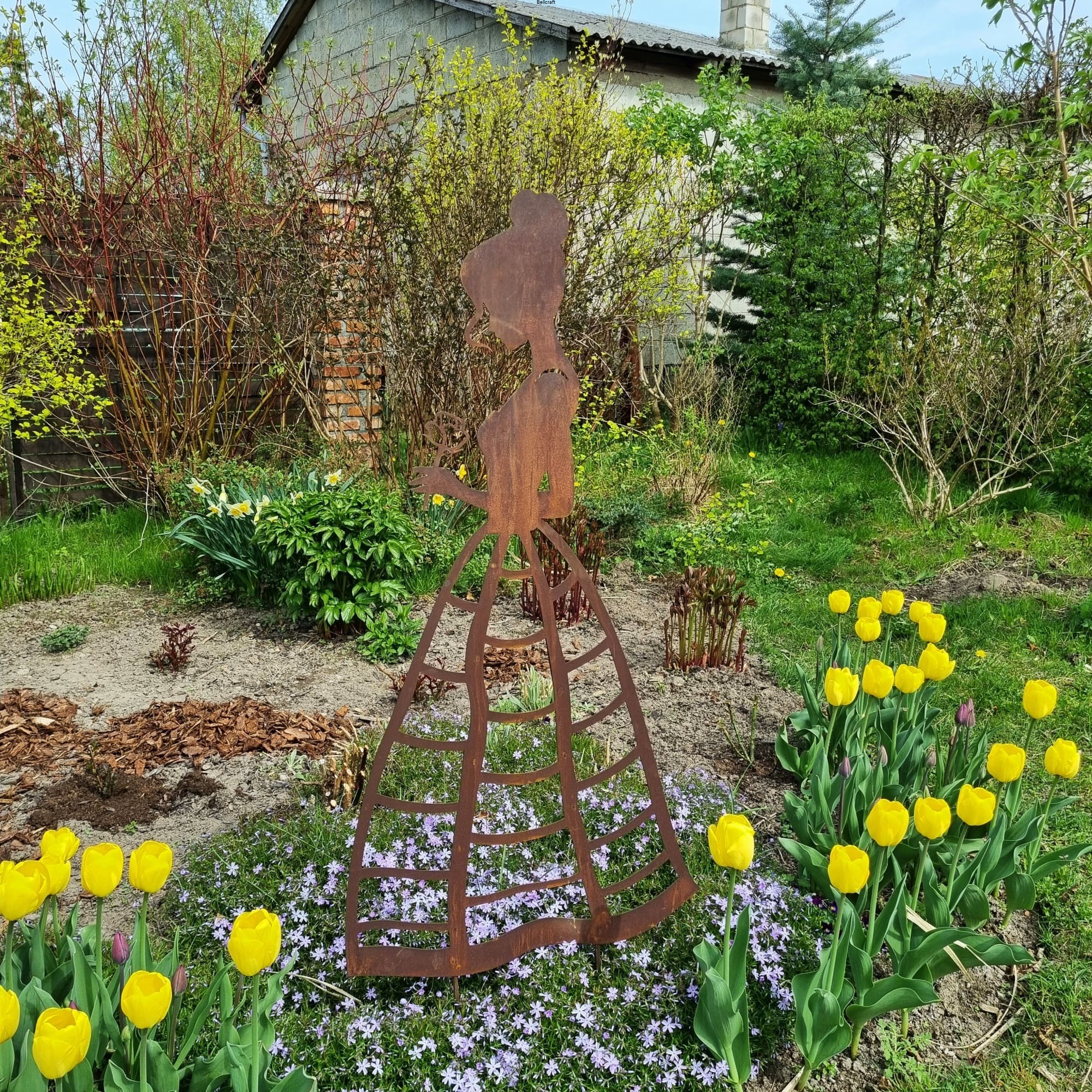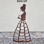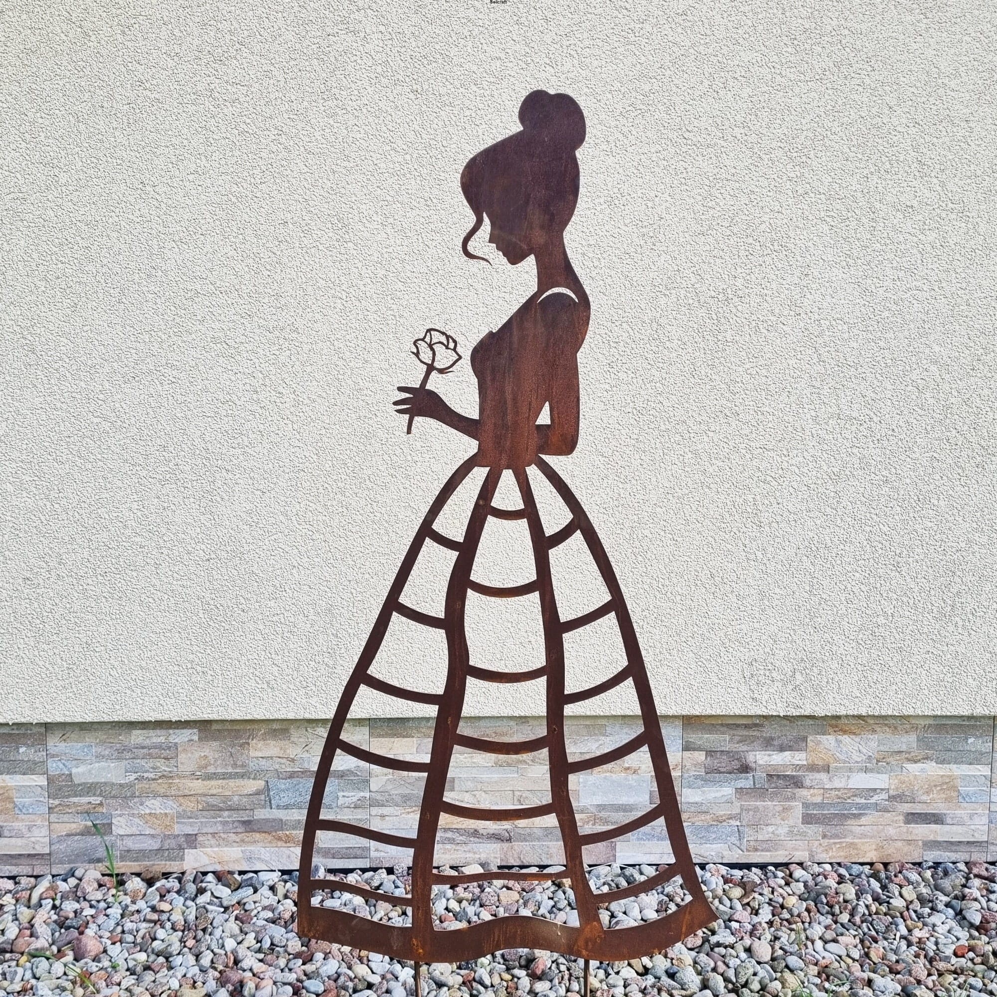 Piękna i okazała dama z różą, wykonana z metalu pokrytego naturalną rdzą, udekoruje każdy ogród. Suknia ma ażurową formę nieregularnej kraty, dzięki czemu może pełnić funkcję podpory pod niewielkie rośliny pnące jak chociażby jednoroczne nasturcje lub niższe delikatne powojniki. Wysokość ażurowej części ozdoby to 75 cm.