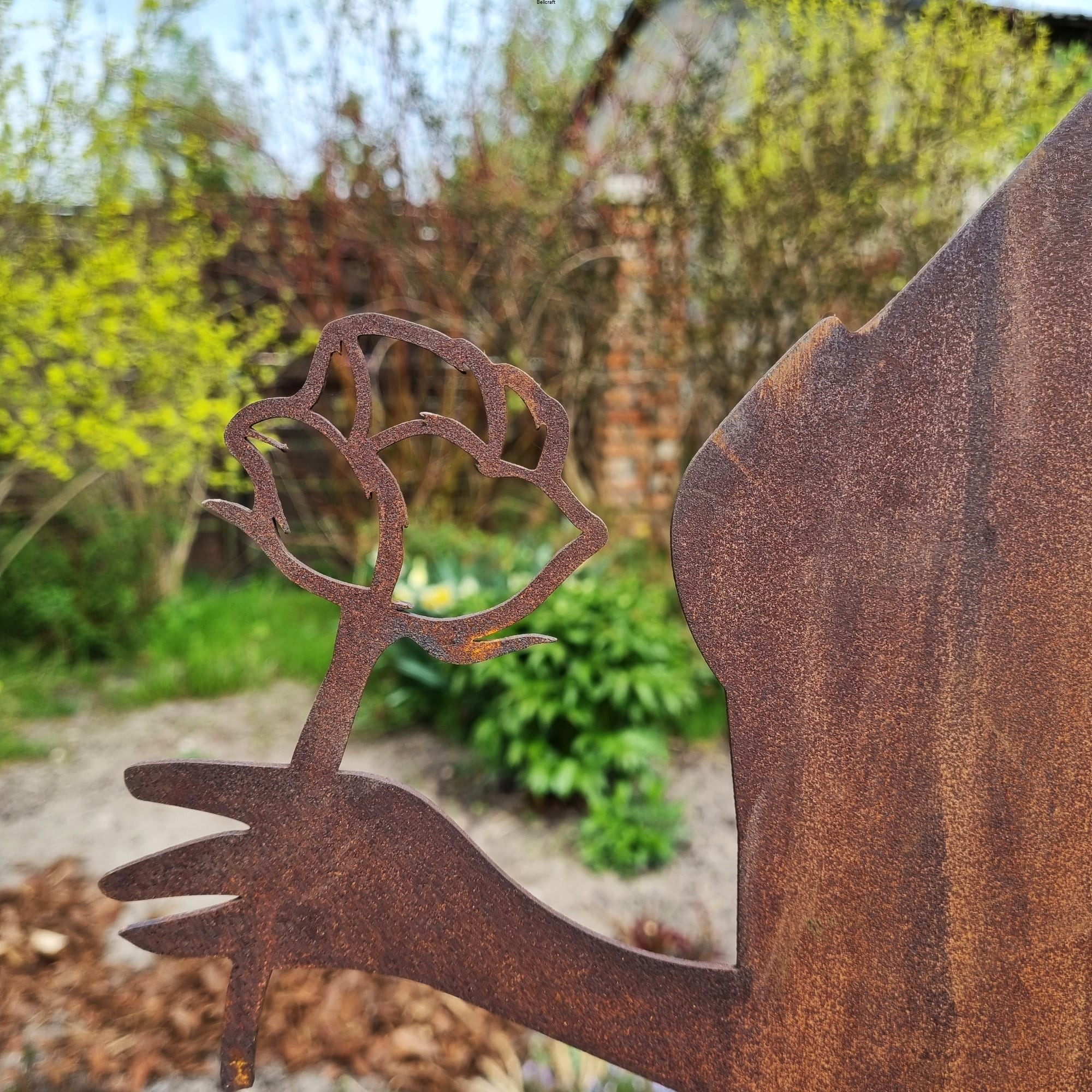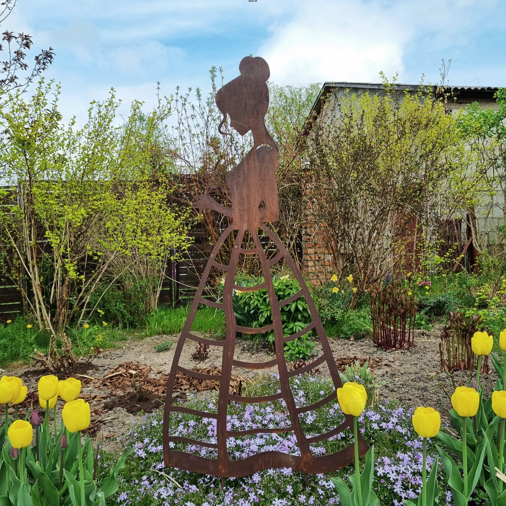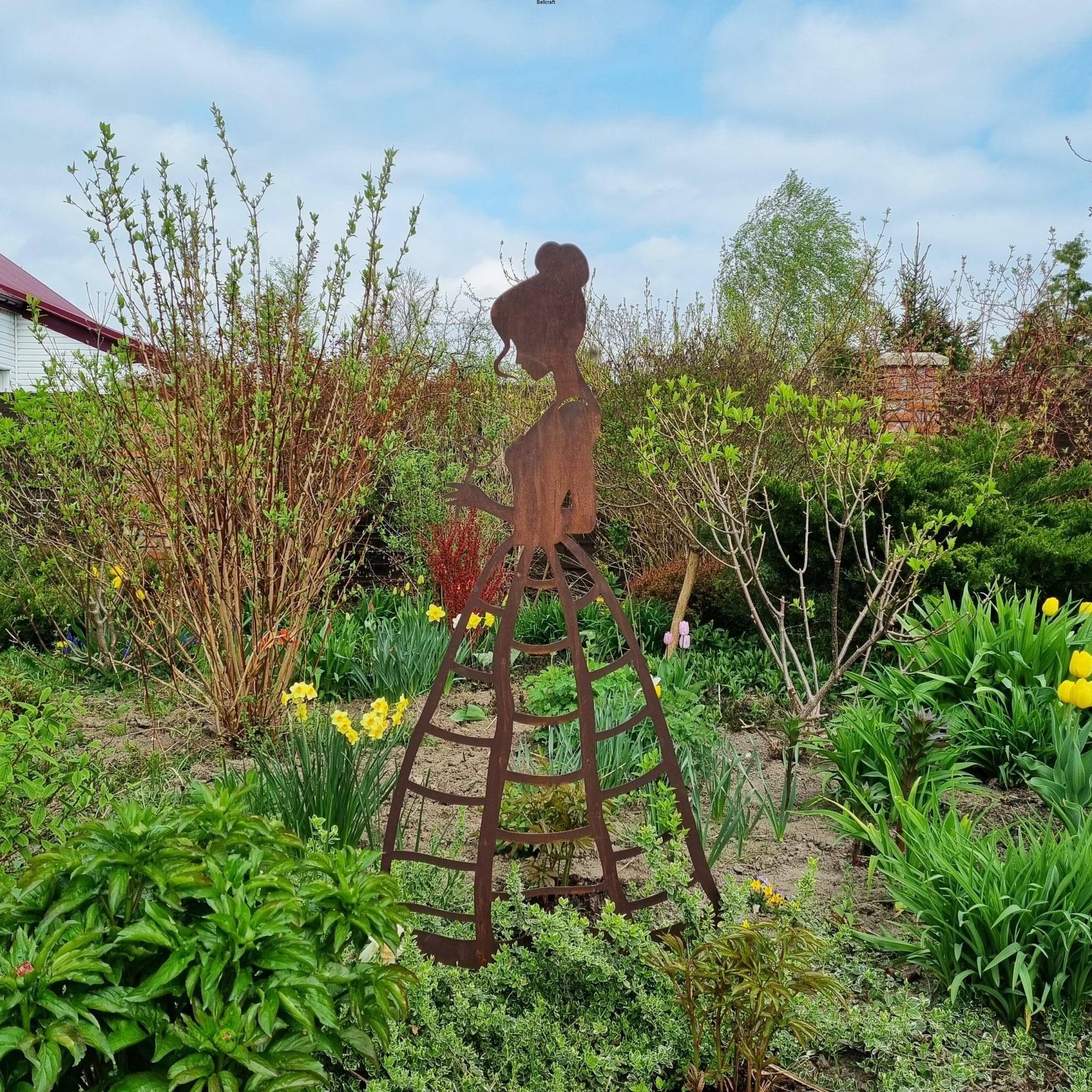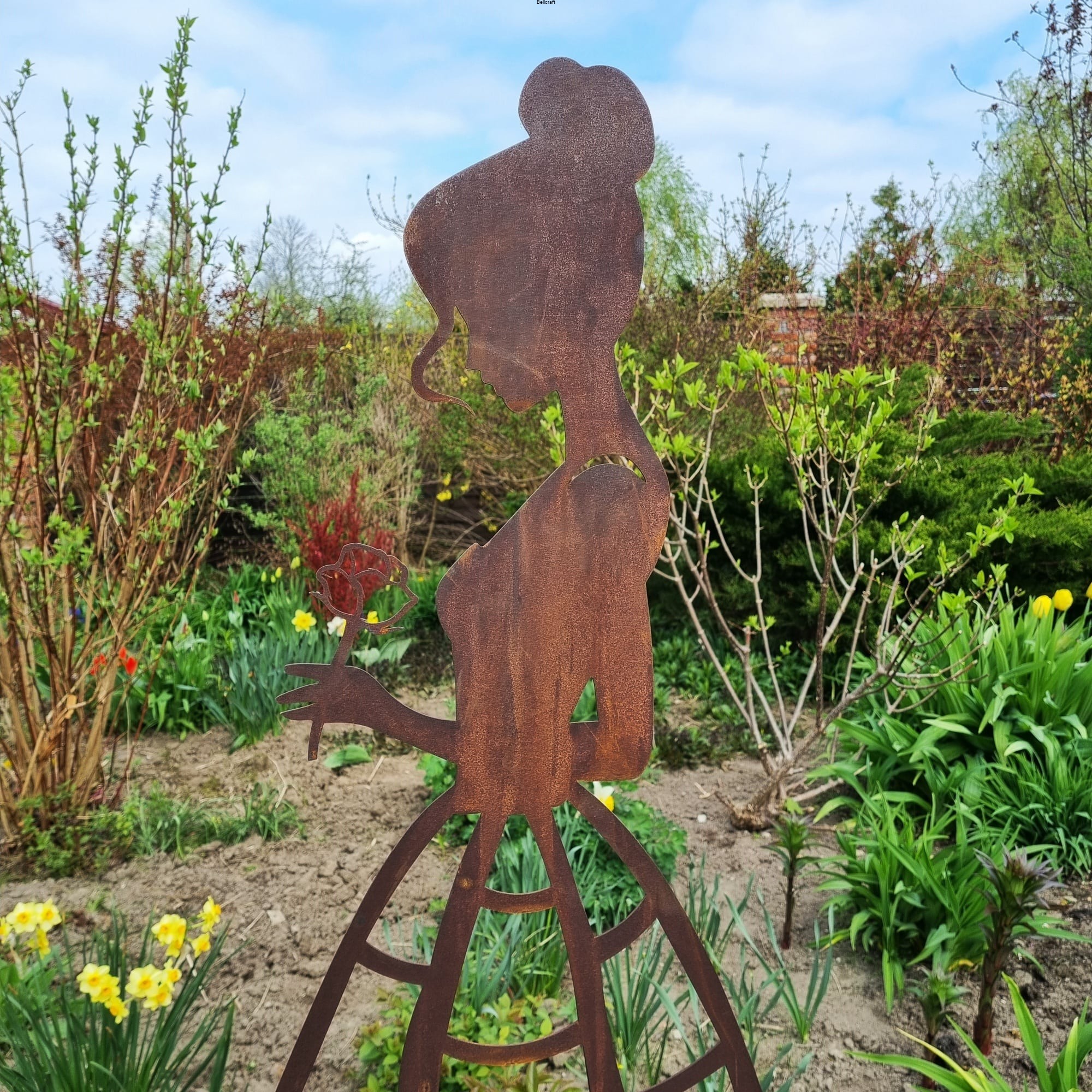 Piękna i okazała dama z różą, wykonana z metalu pokrytego naturalną rdzą, udekoruje każdy ogród. Suknia ma ażurową formę nieregularnej kraty, dzięki czemu może pełnić funkcję podpory pod niewielkie rośliny pnące jak chociażby jednoroczne nasturcje lub niższe delikatne powojniki. Wysokość ażurowej części ozdoby to 75 cm.