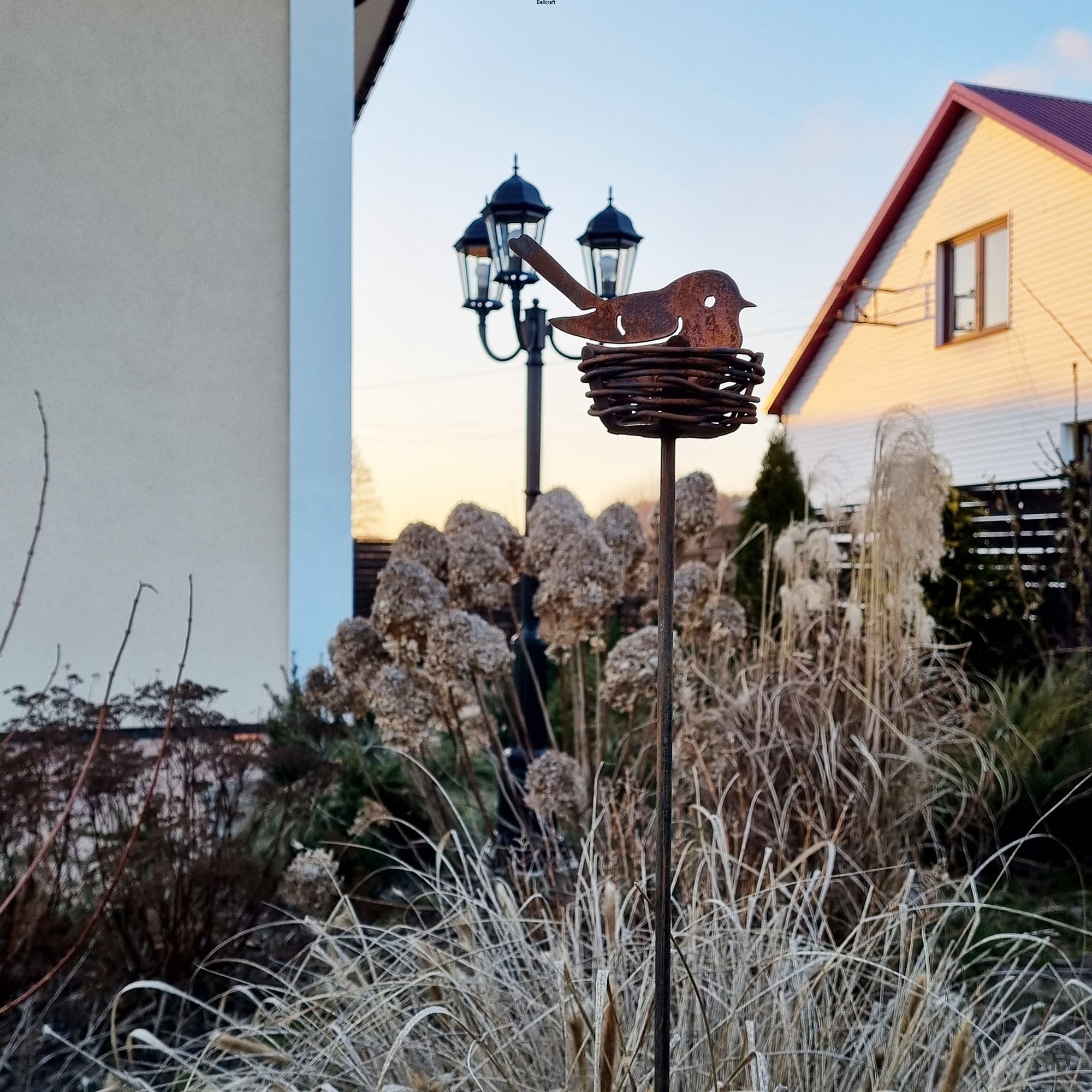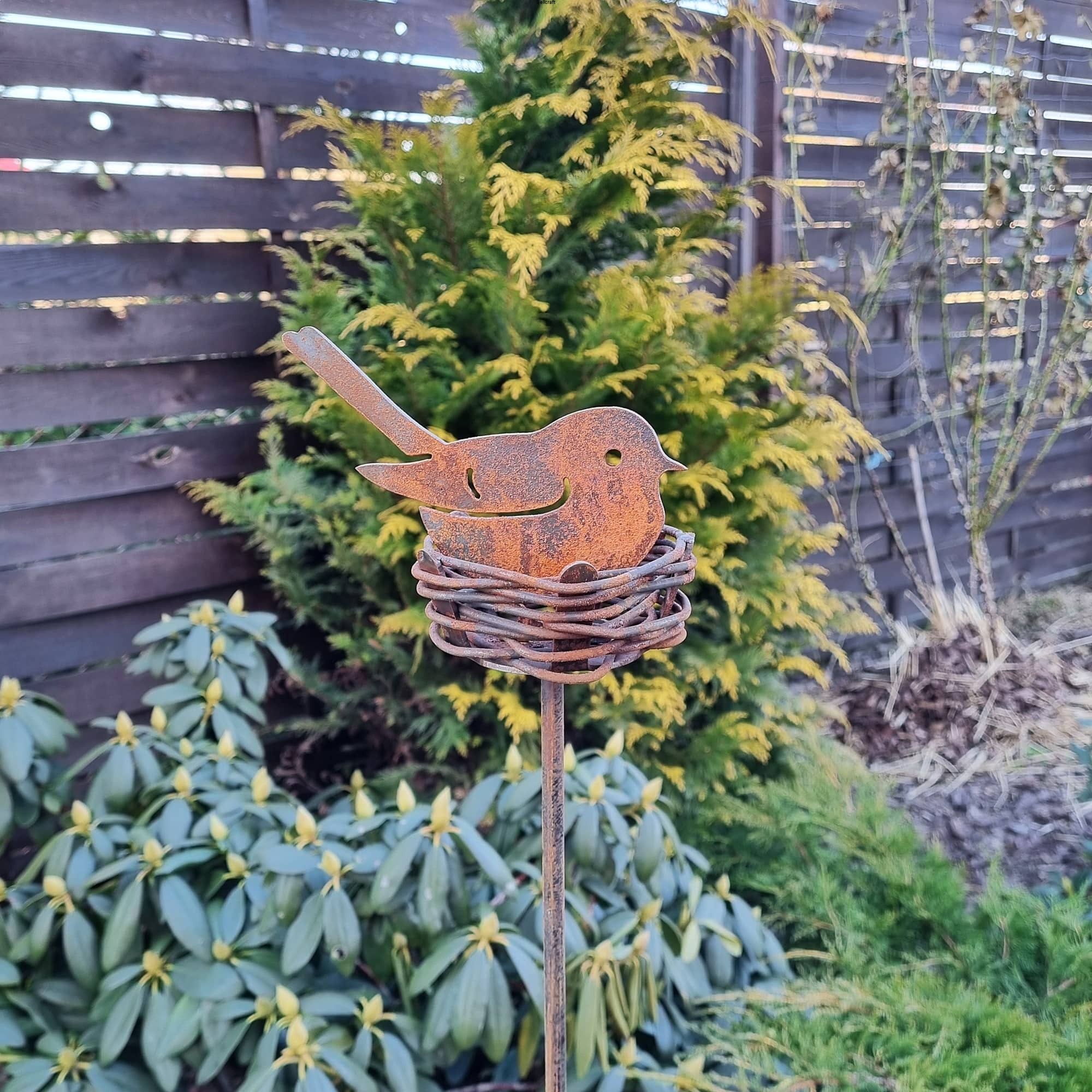 Urocza metalowa dekoracja w kształcie przestrzennego gniazdka z ptaszkiem na wysokim pręcie. Wyjątkowo dekoracyjna zwłaszcza w okresie wiosenno-letnim. Gniazdko jest ręcznie oplecione stalowym drutem, przez co każda ozdoba jest nieco inna. Polecamy dla każdego miłośnika ptaków w ogrodzie.