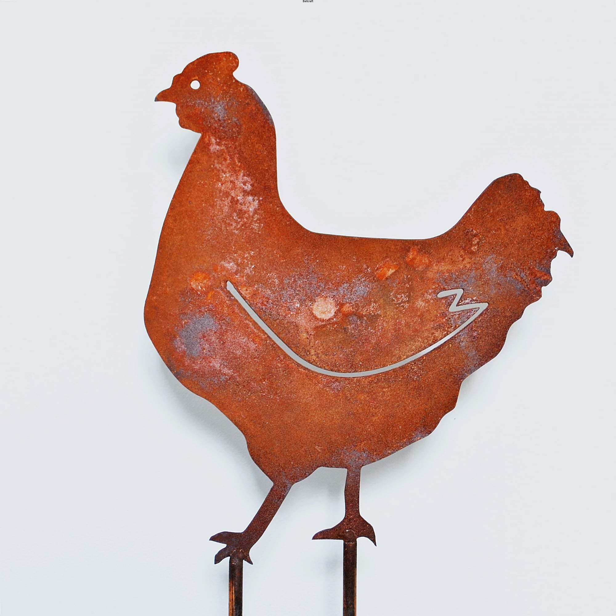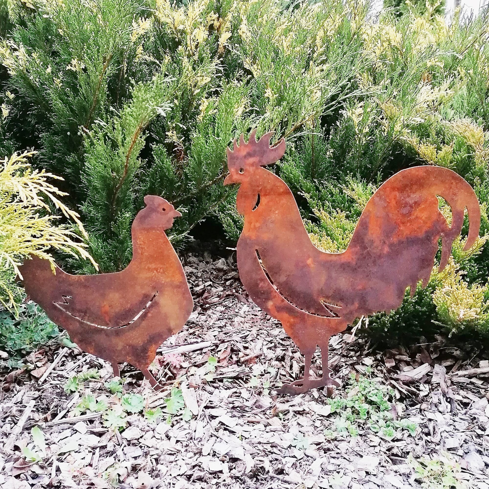 Rajski kogucik i kurka z rdzewionej blachy - piękna metalowa dekoracja do ogrodu o wiejskim charakterze.