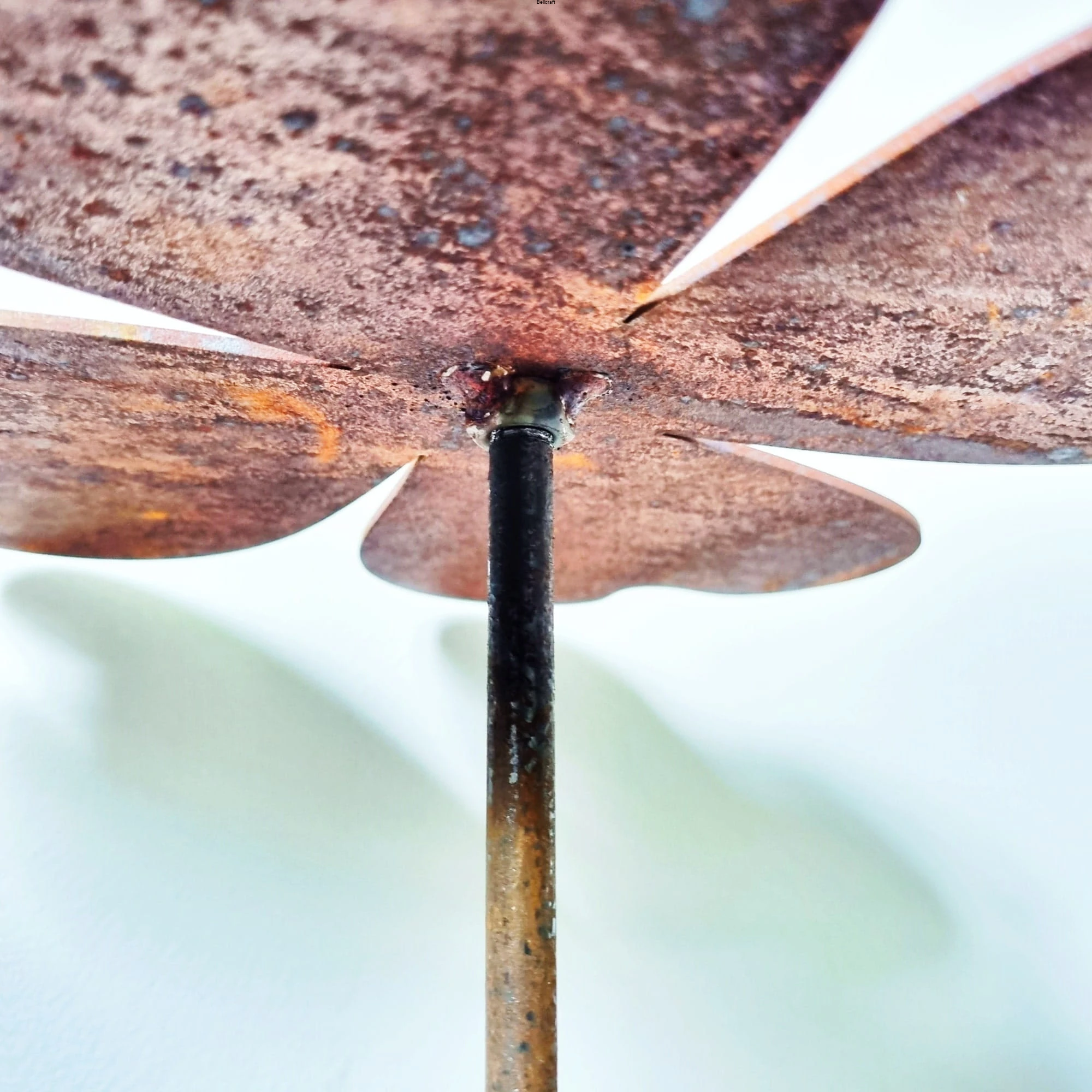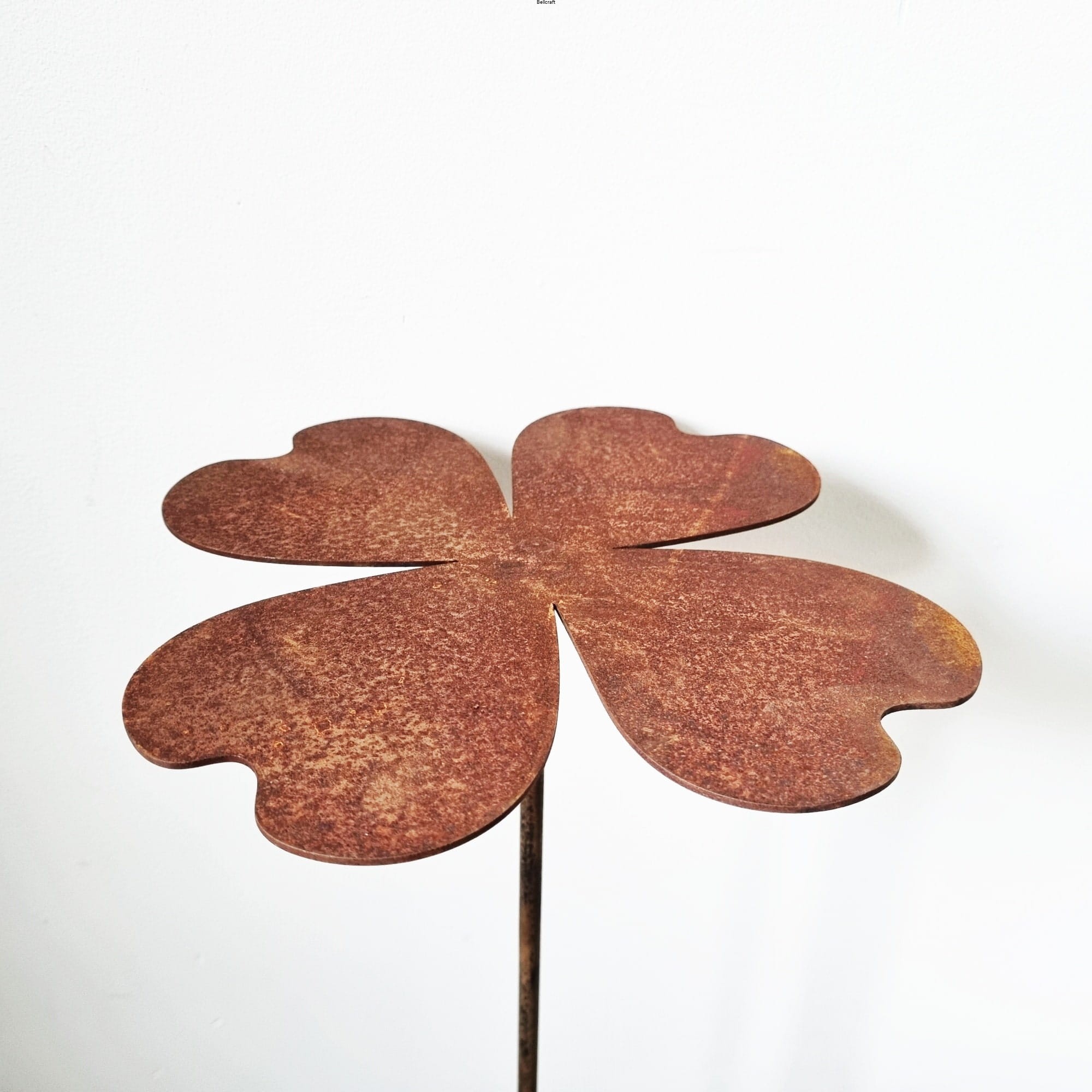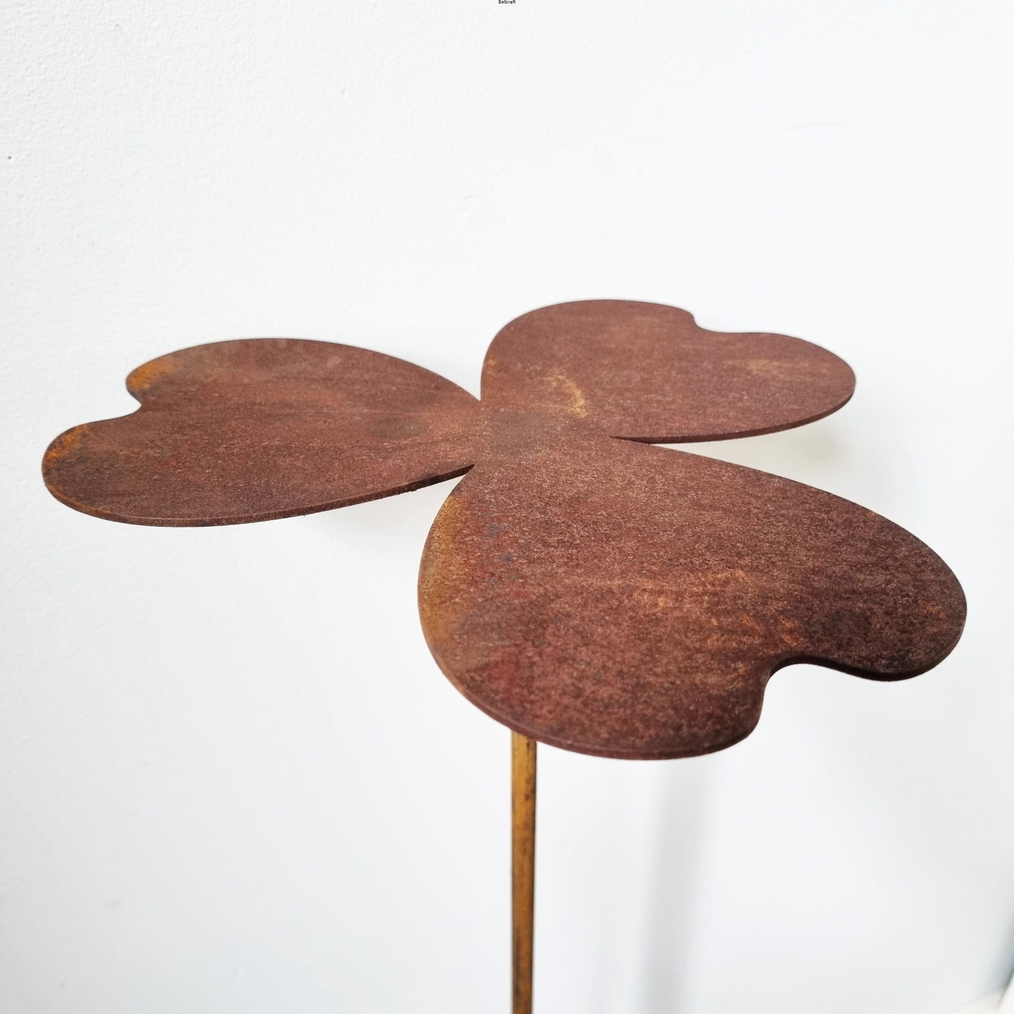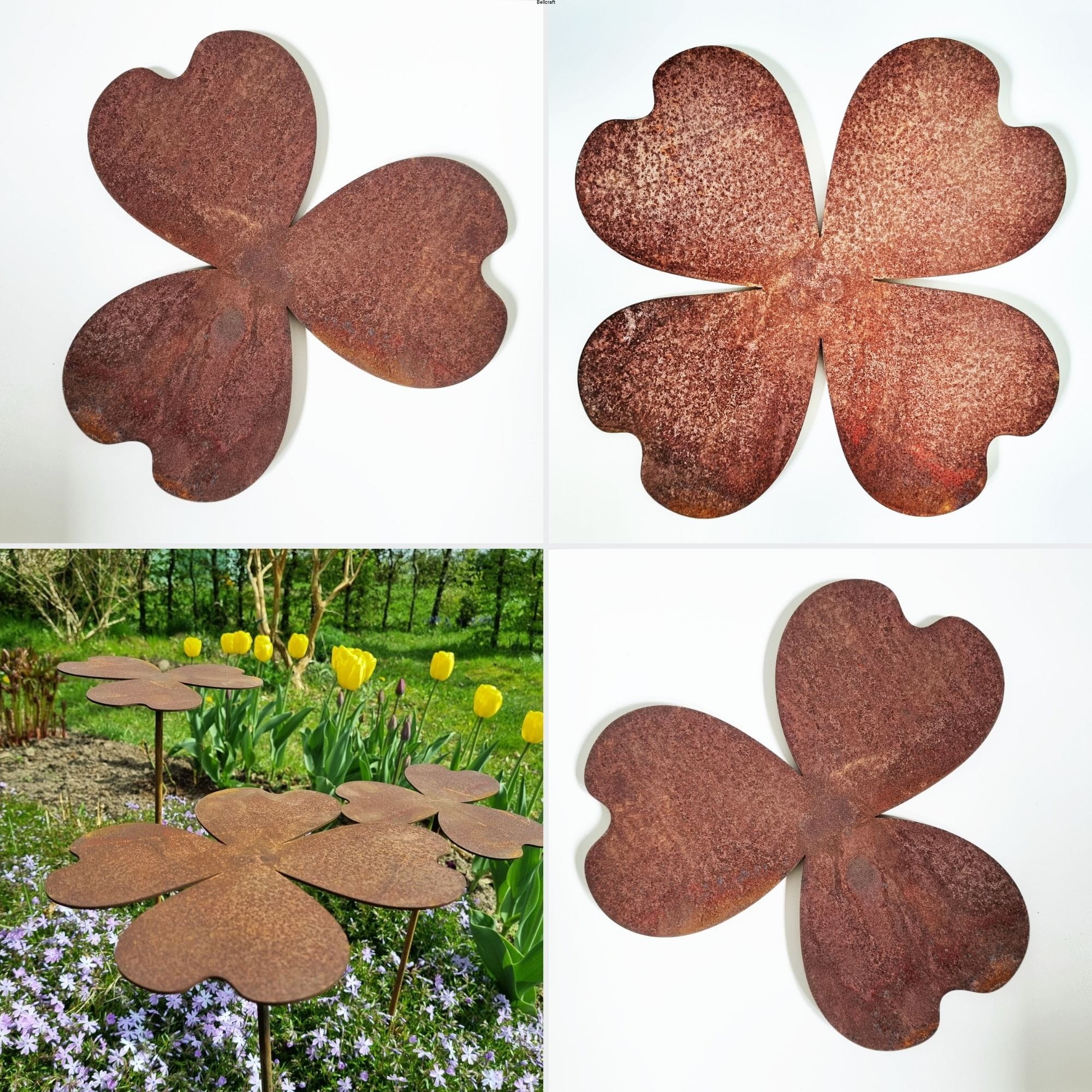 Zestaw trzech uroczych koniczynek z metalu pokrytego naturalną rdzą. W zestawie znajdują się dwie szt. koniczynek z trzema listkami oraz jedna czterolistna przynosząca szczęście ;).