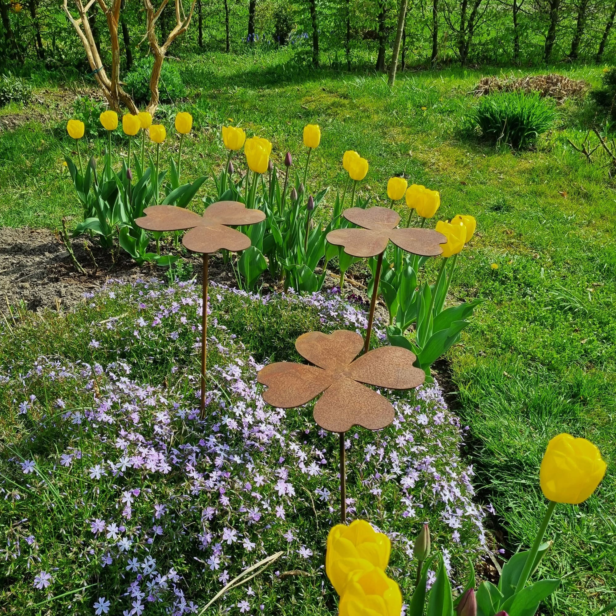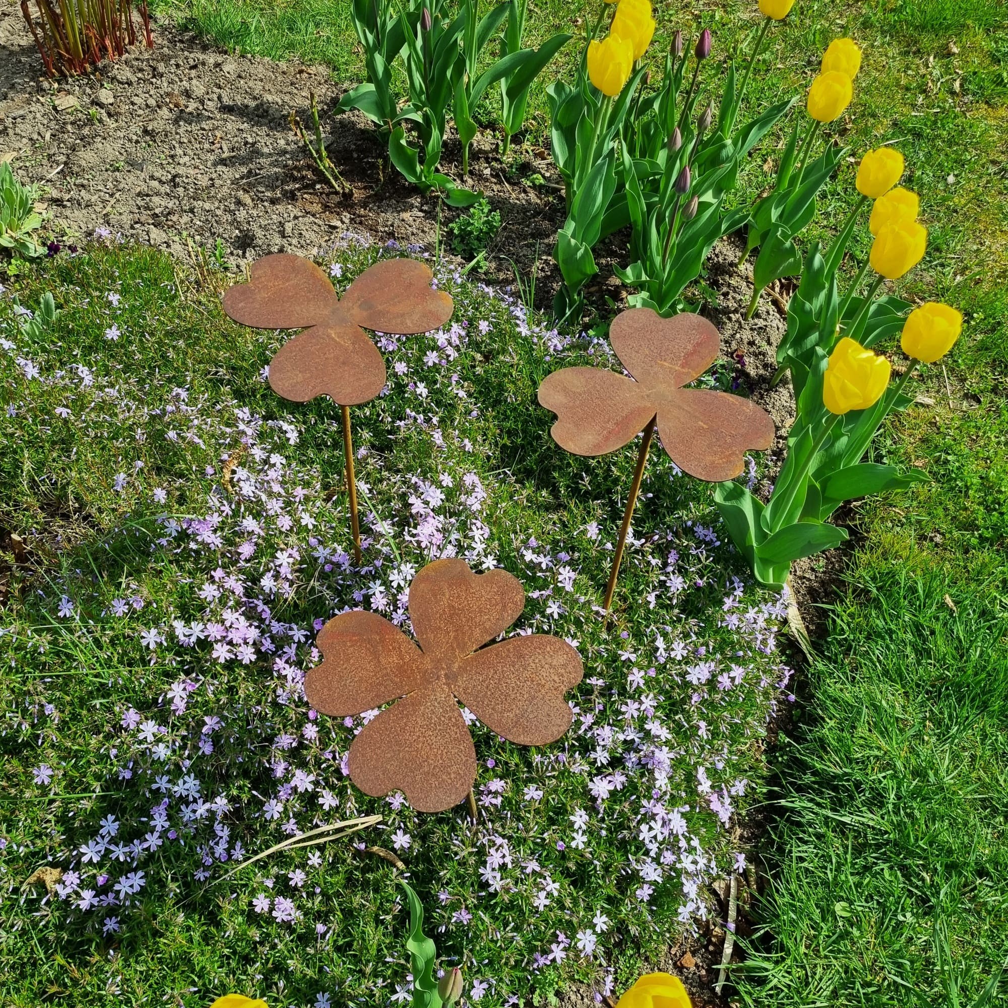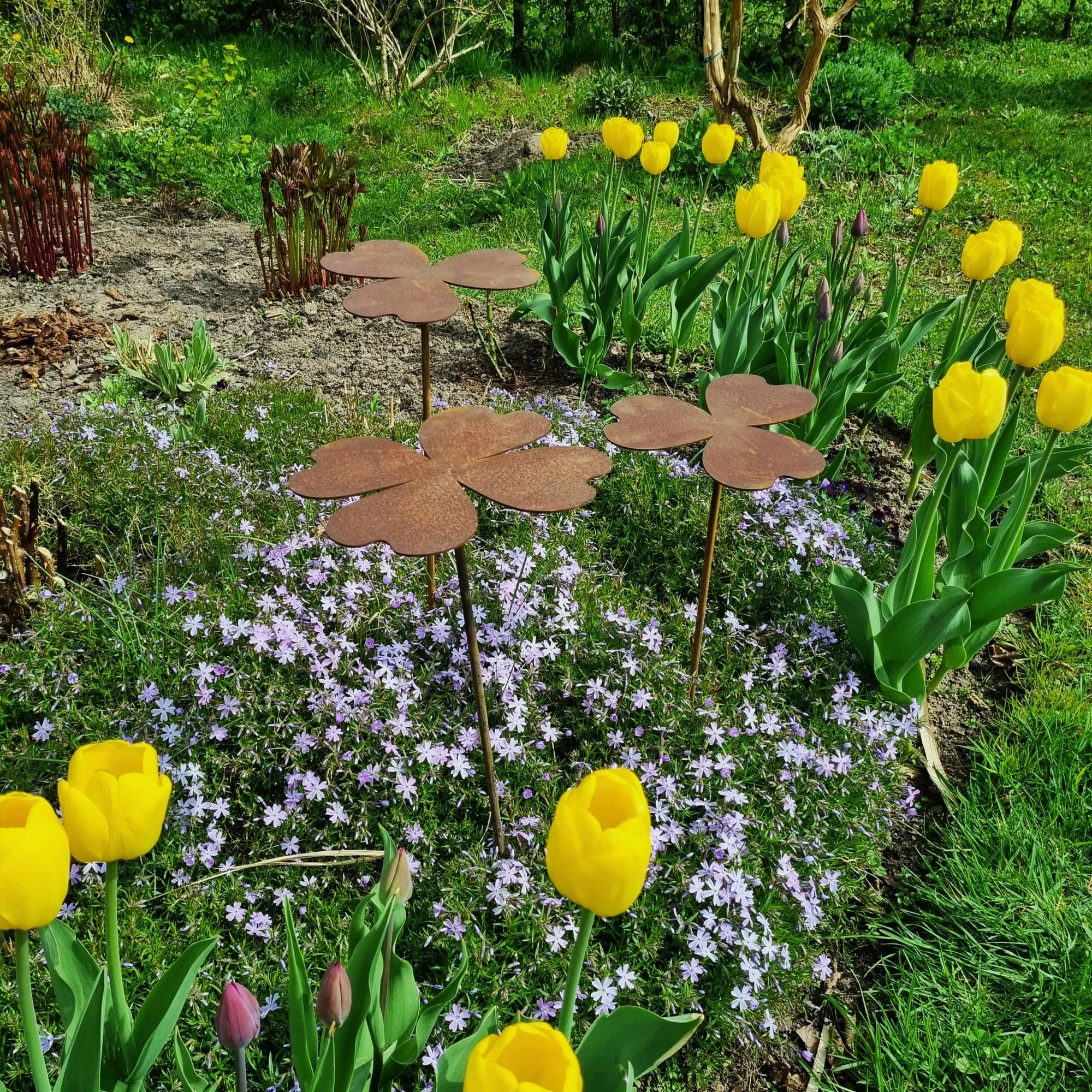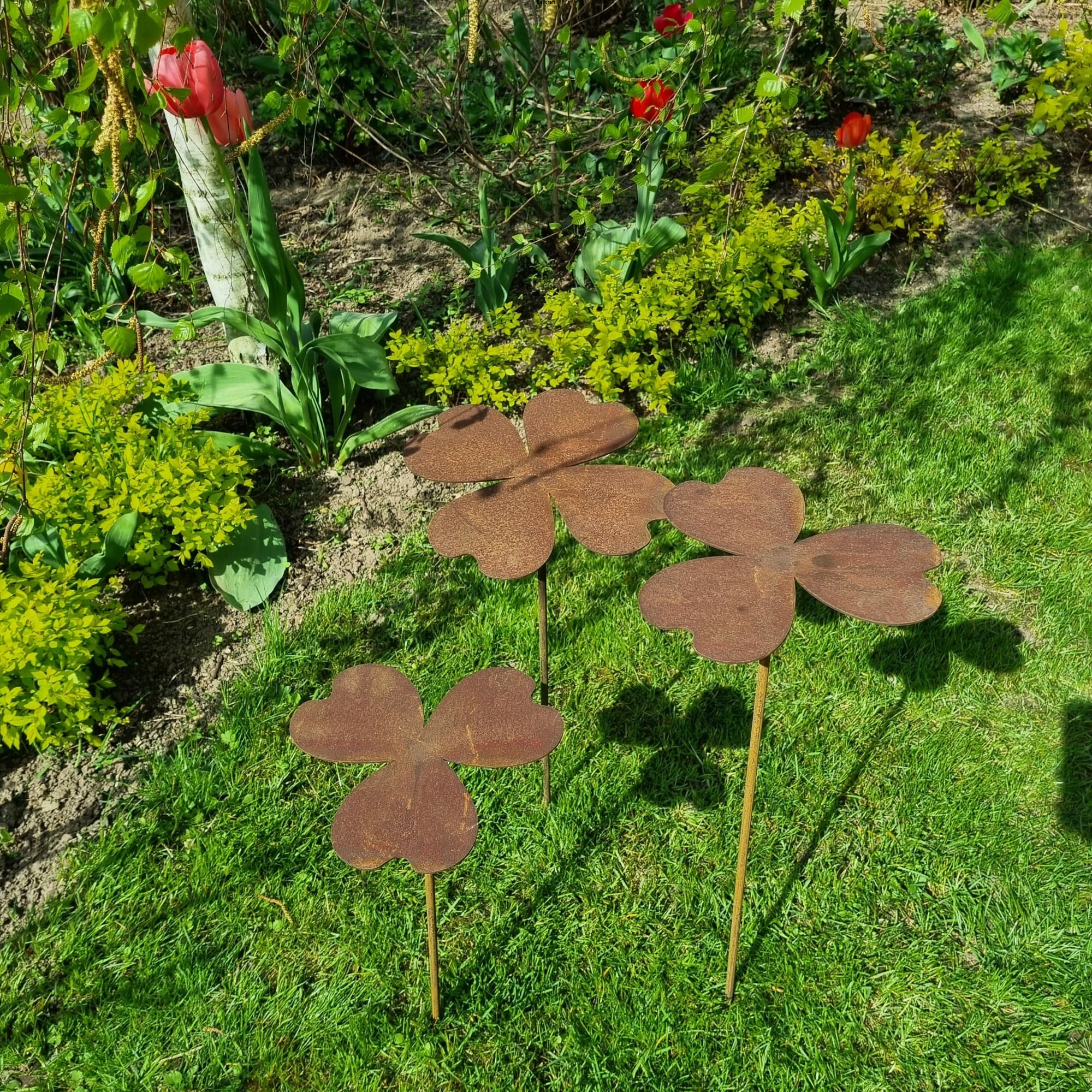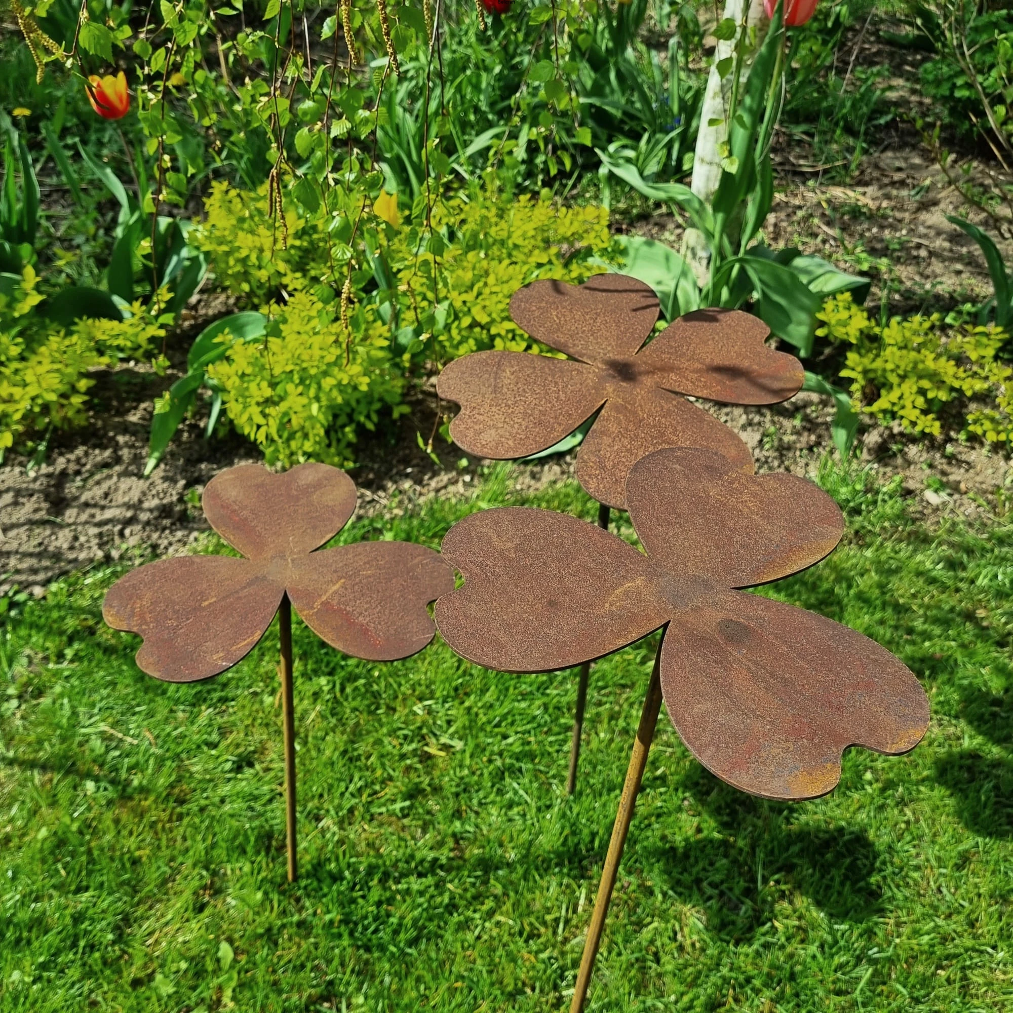 Koniczynki mają odpowiednio niższe pręty, żedy dekoracja wyglądała jak najbardziej naturalistycznie. W związku z tym zestaw będzie idealnym dopełnieniem niskiej rabaty kwiatowej. Pięknie będzie się też prezentował na zwykłym trawniku.