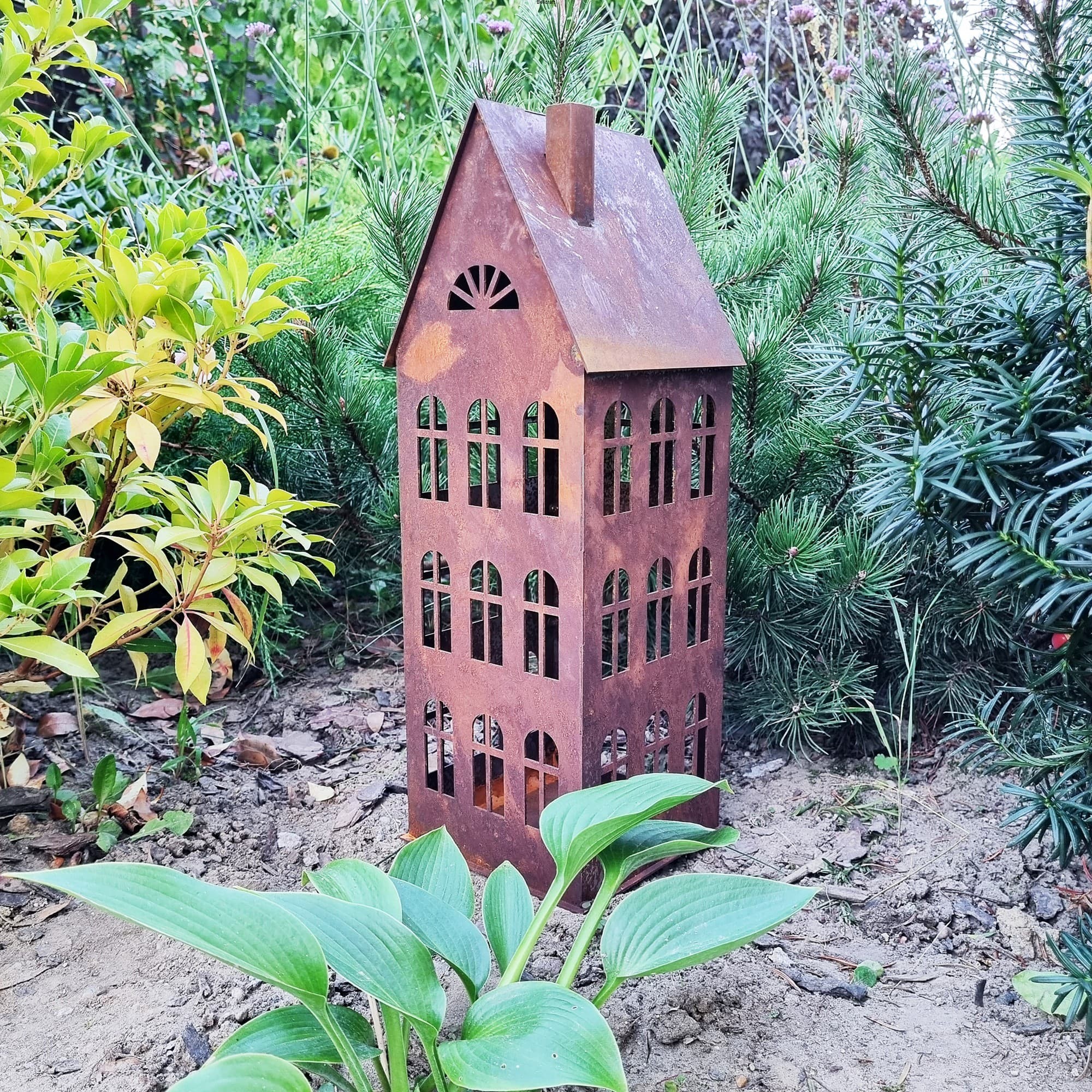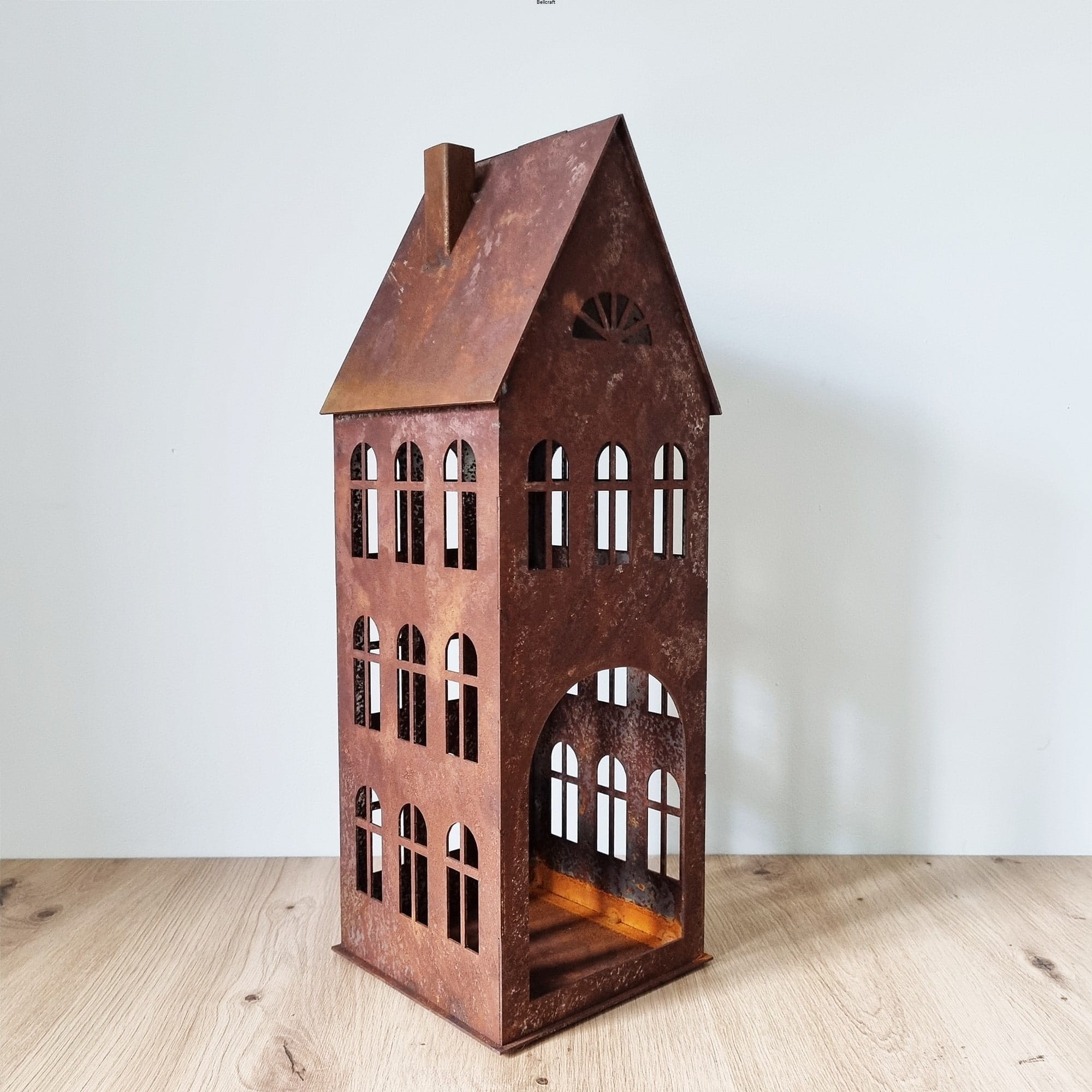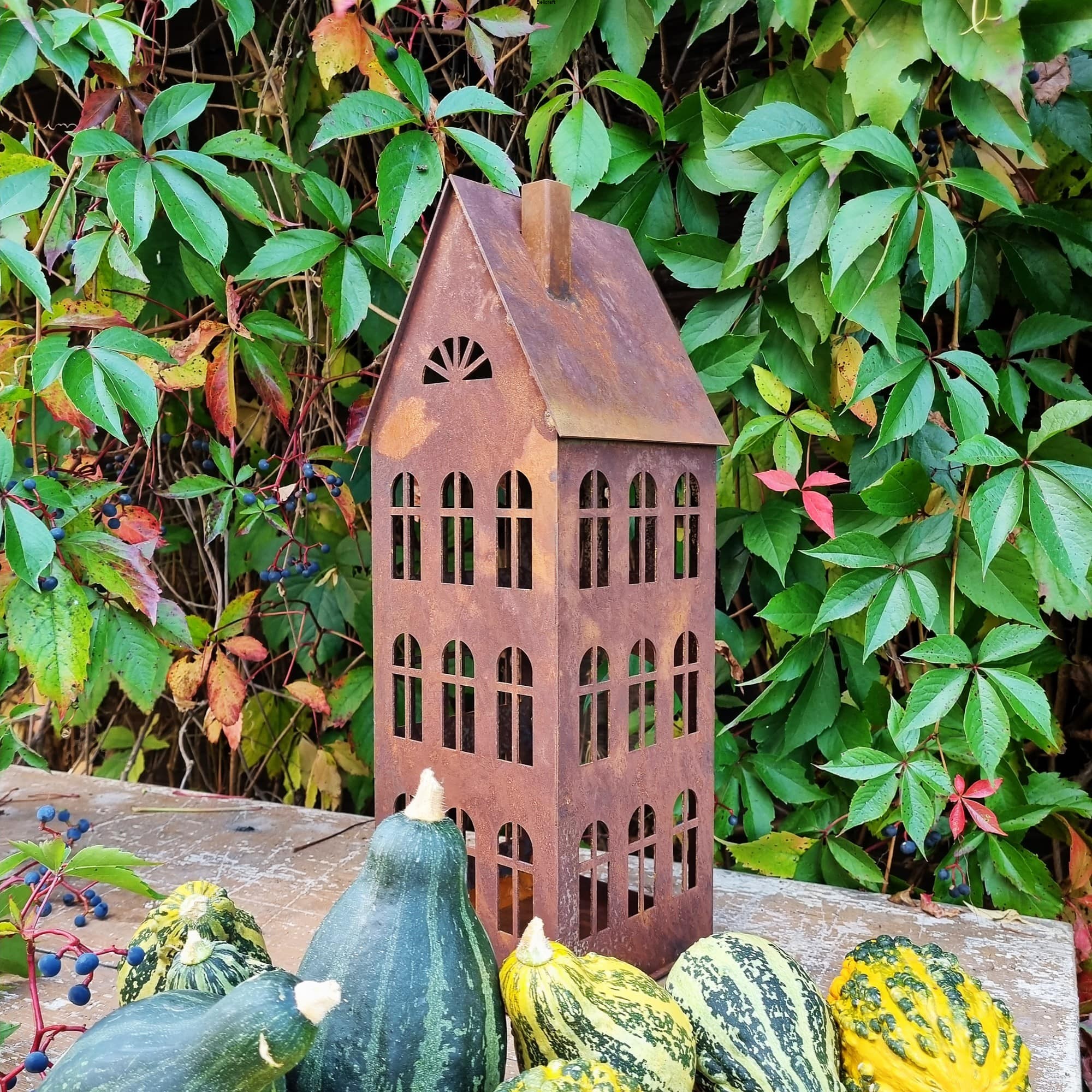 Wyjątkowy i okazały domek - latarenka na świecę lub lampki. Domek jest z metalu pokrytego naturalną rdzą. Jest wykonany bardzo starannie z grubej 1,5 mm blachy, jest ciężki i solidny, co odróżnia go od delikatnych marketowych zamienników.
