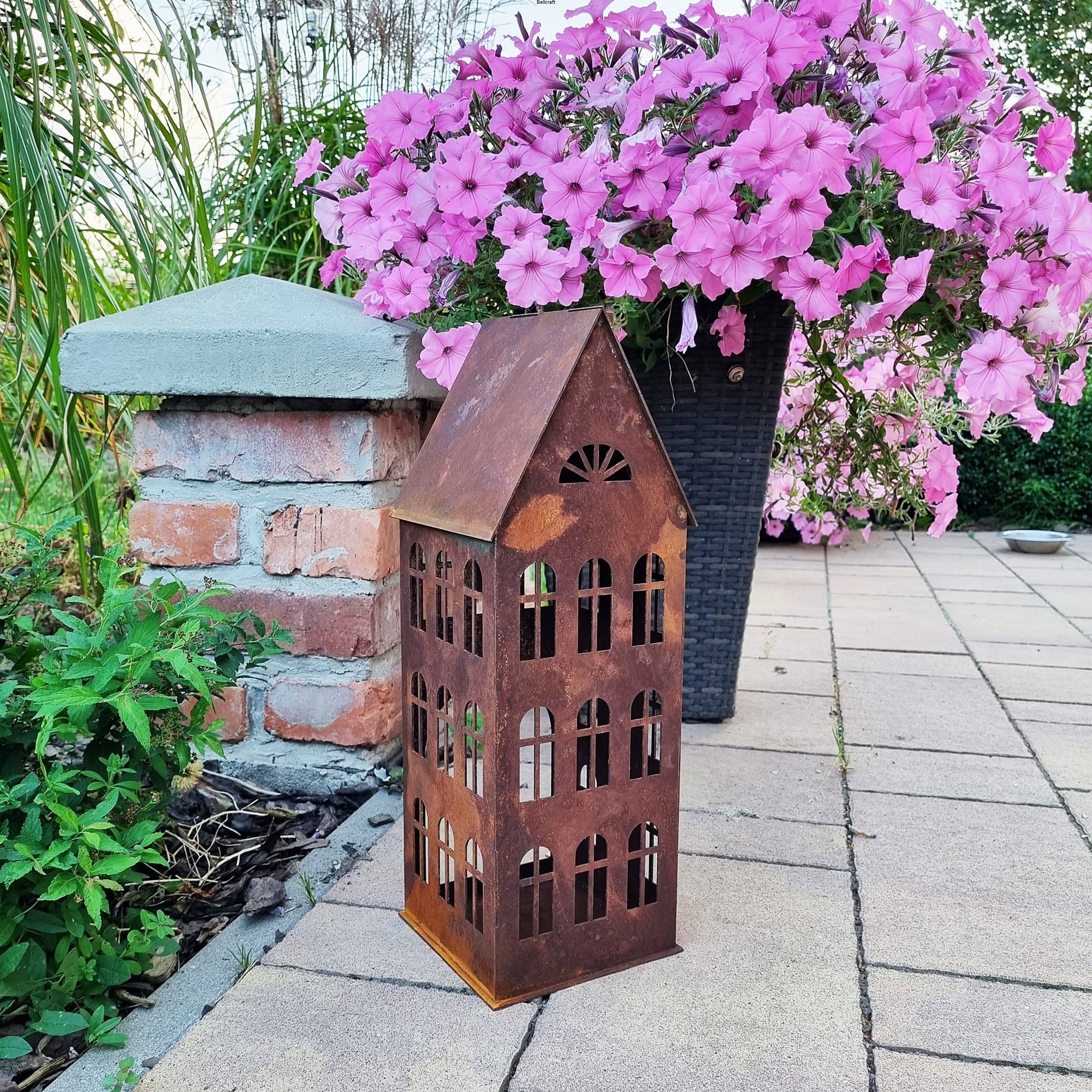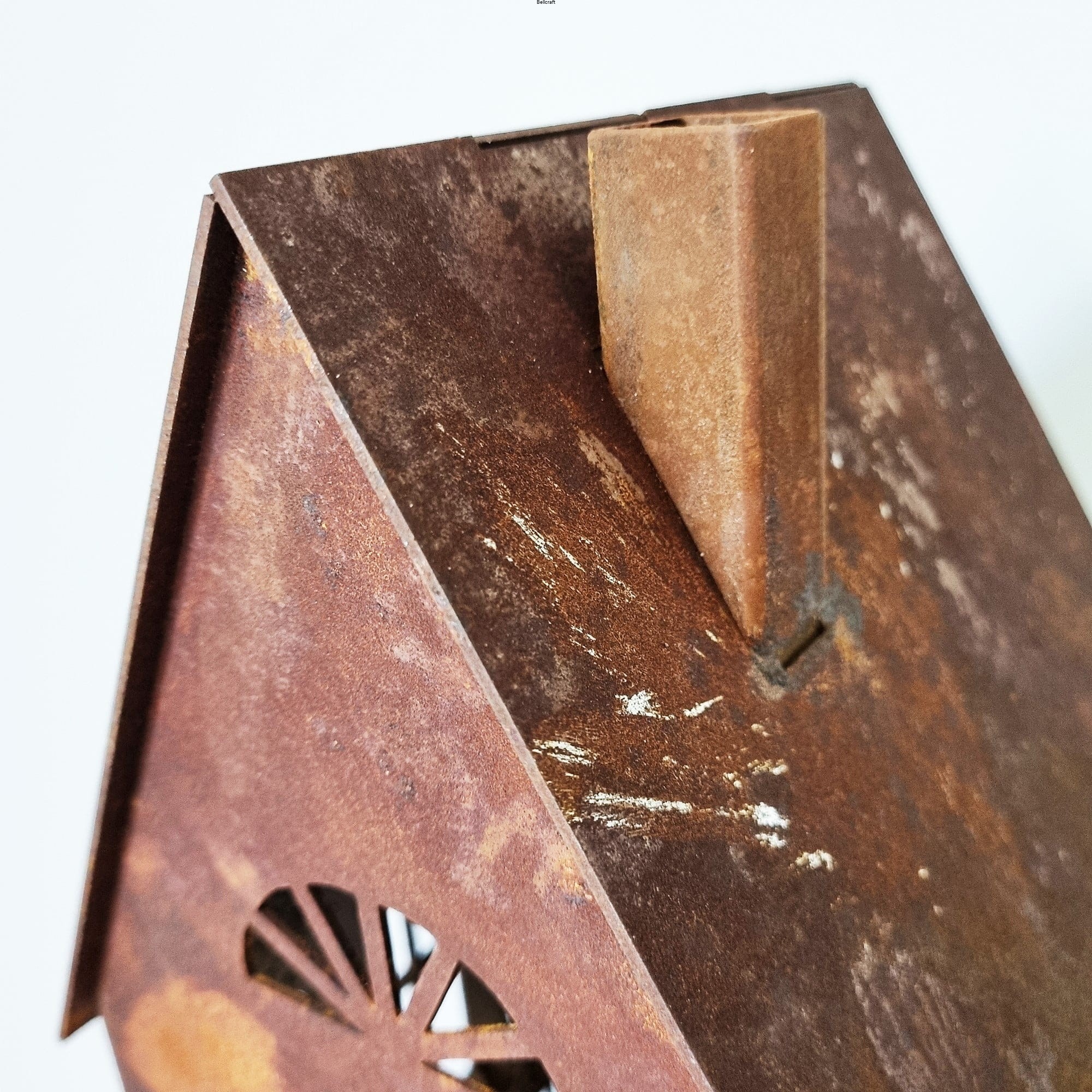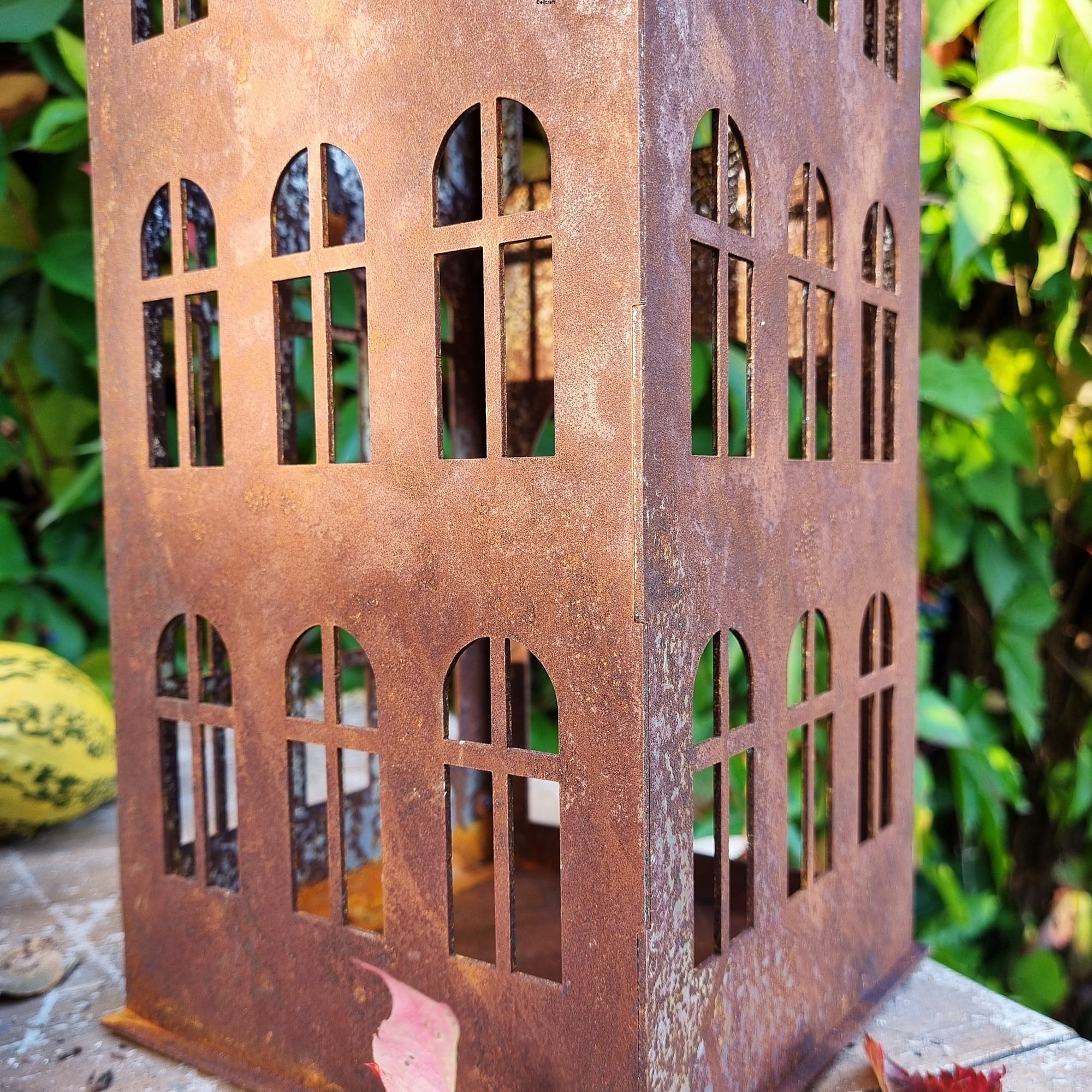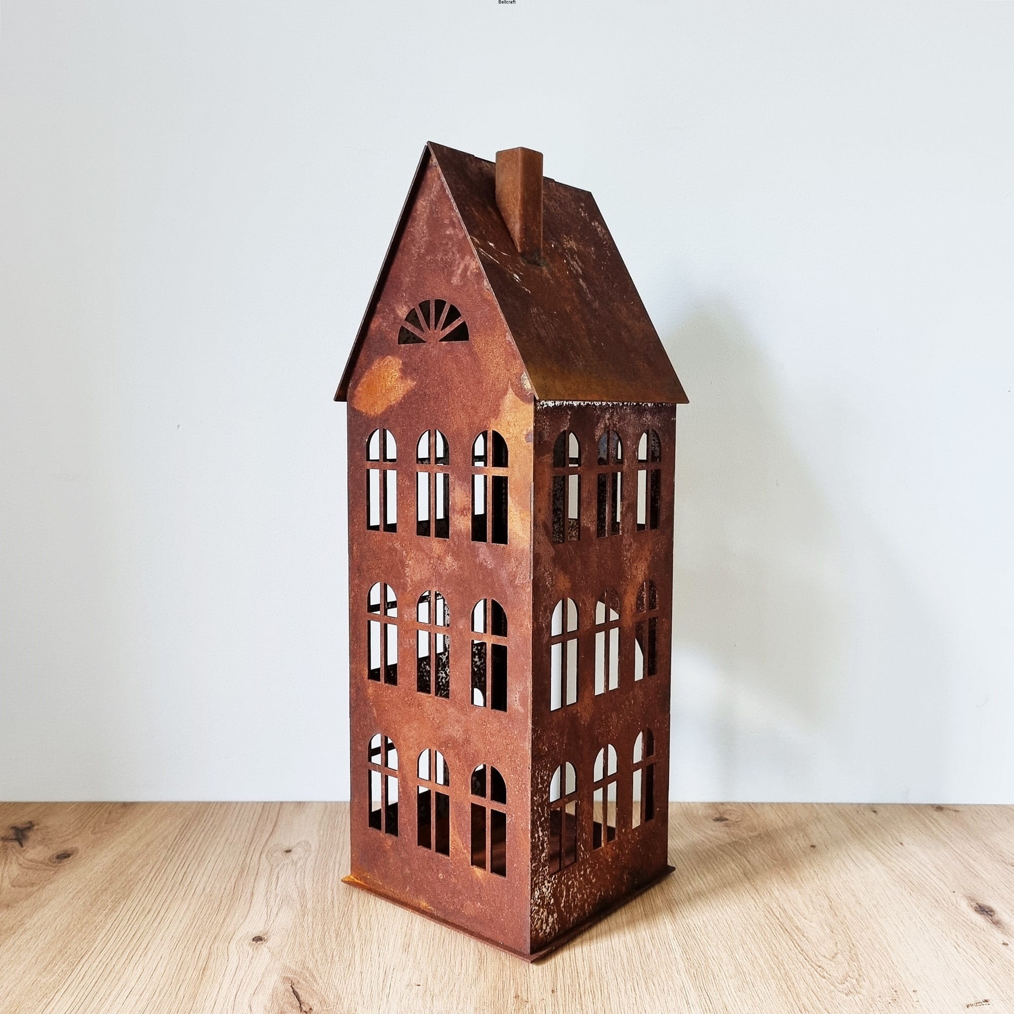 Wyjątkowy i okazały domek - latarenka na świecę lub lampki. Domek jest z metalu pokrytego naturalną rdzą. Jest wykonany bardzo starannie z grubej 1,5 mm blachy, jest ciężki i solidny, co odróżnia go od delikatnych marketowych zamienników.