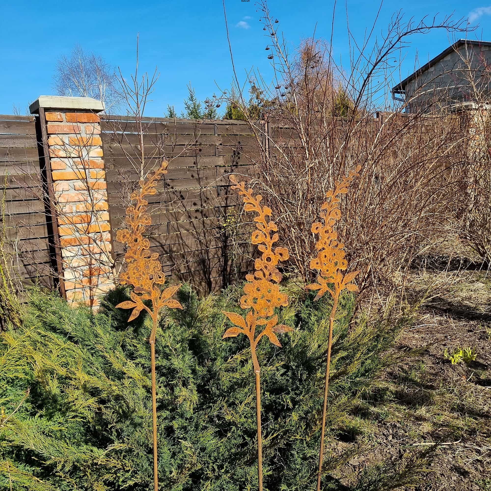 Zestaw 3 szt. pięknych metalowych dekoracji w kształcie kwiatu ostróżki, na wysokim pręcie. Ozdoby będą się pięknie prezentować na każdej kwiatowej rabacie. Polecamy zwłaszcza do towarzystwa dla traw, jeżówek, krwawników i innych bylin.