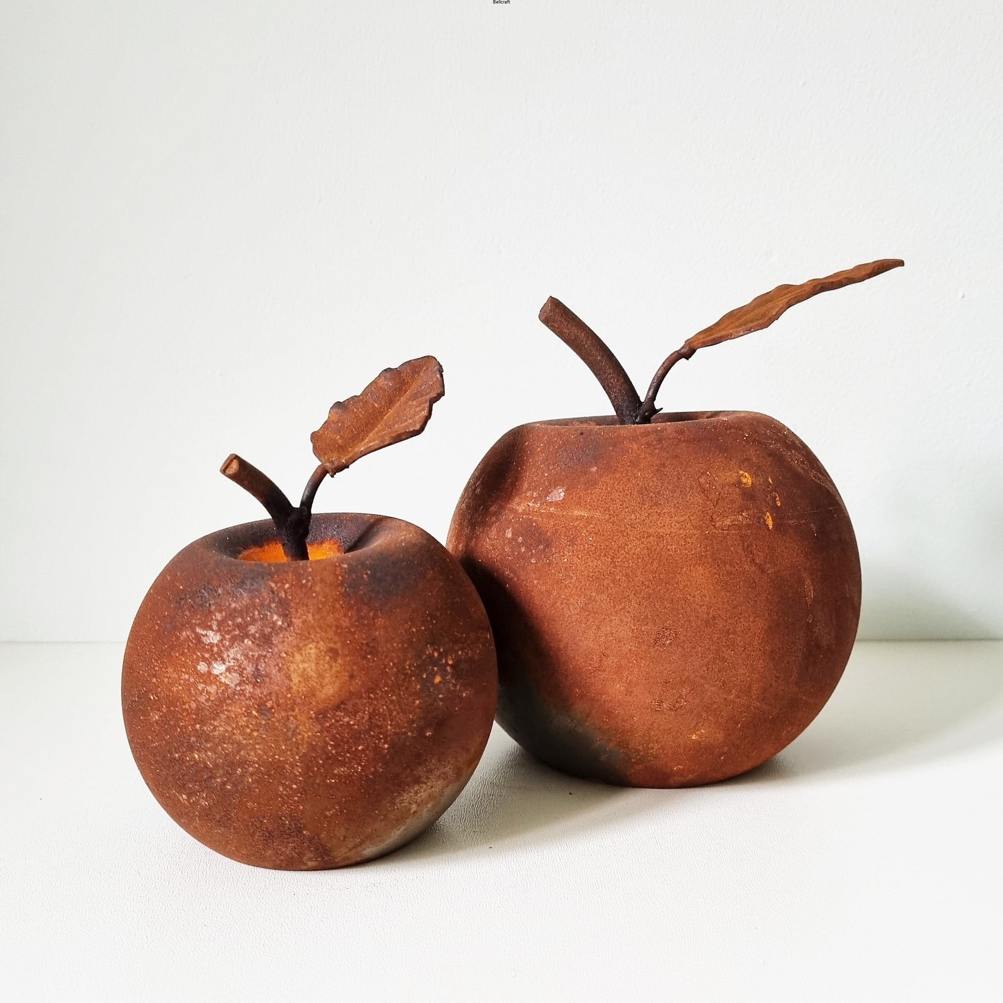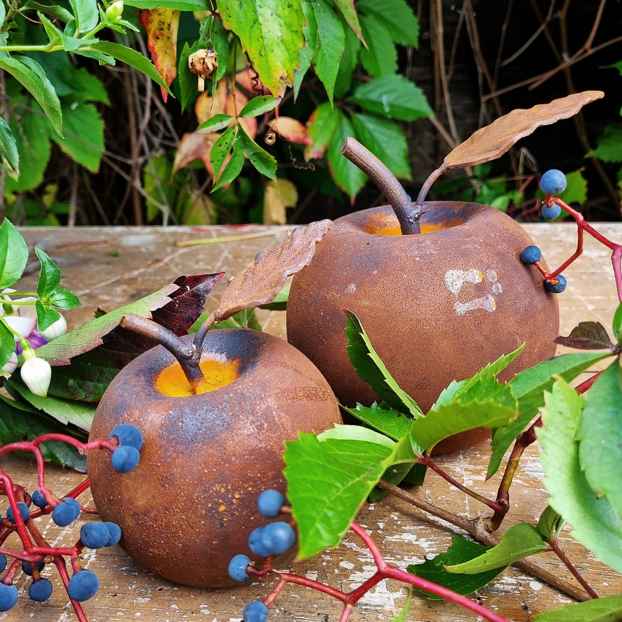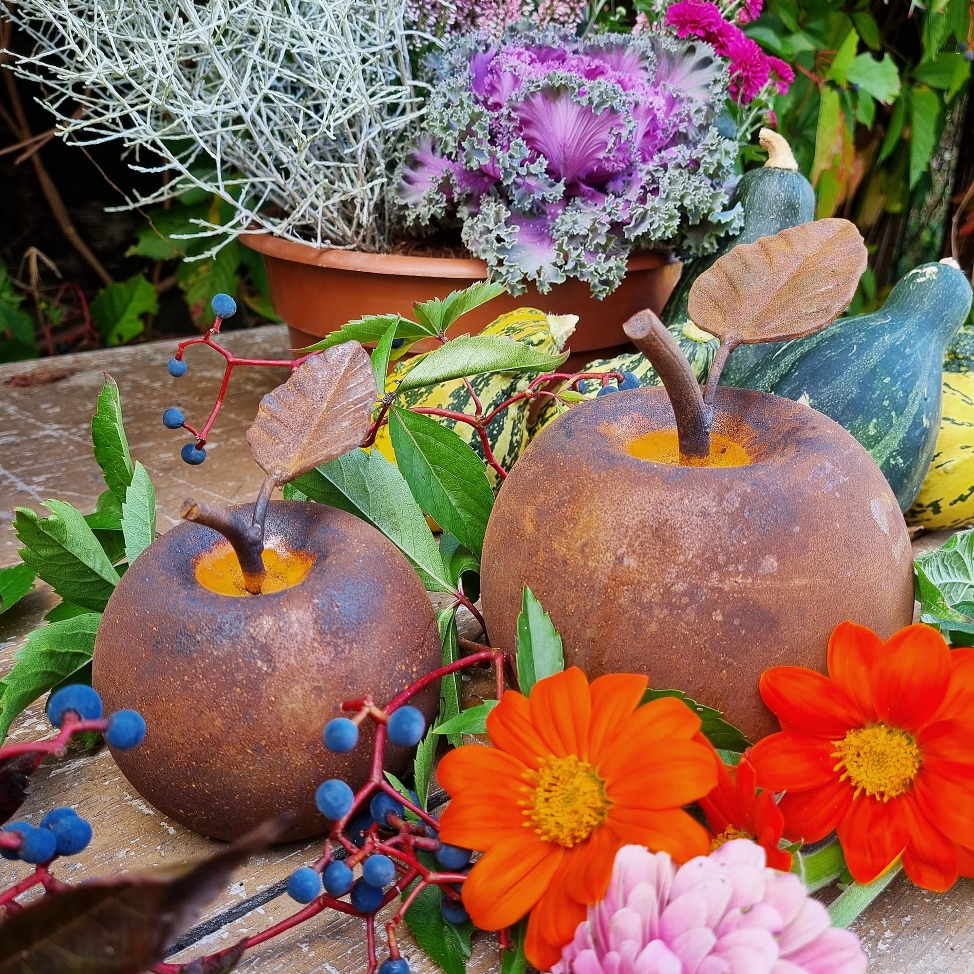 Zestaw 2 szt. metalowych dekoracji w formie jabłek. Ozdoby wykonane są na bazie stalowych, pustych w środku kul o średnicy 12 cm i 9 cm. Ze względu na ścięty spód, jabłka stoją stabilnie na każdej powierzchni. Wspaniale sprawdzą się we wszelkich dekoracyjnych kompozycjach w ogrodzie, na tarasie czy nawet balkonie. Mogą być też piękną ozdobą stołu, zwłaszcza w okresie jesiennym lub zimowym.