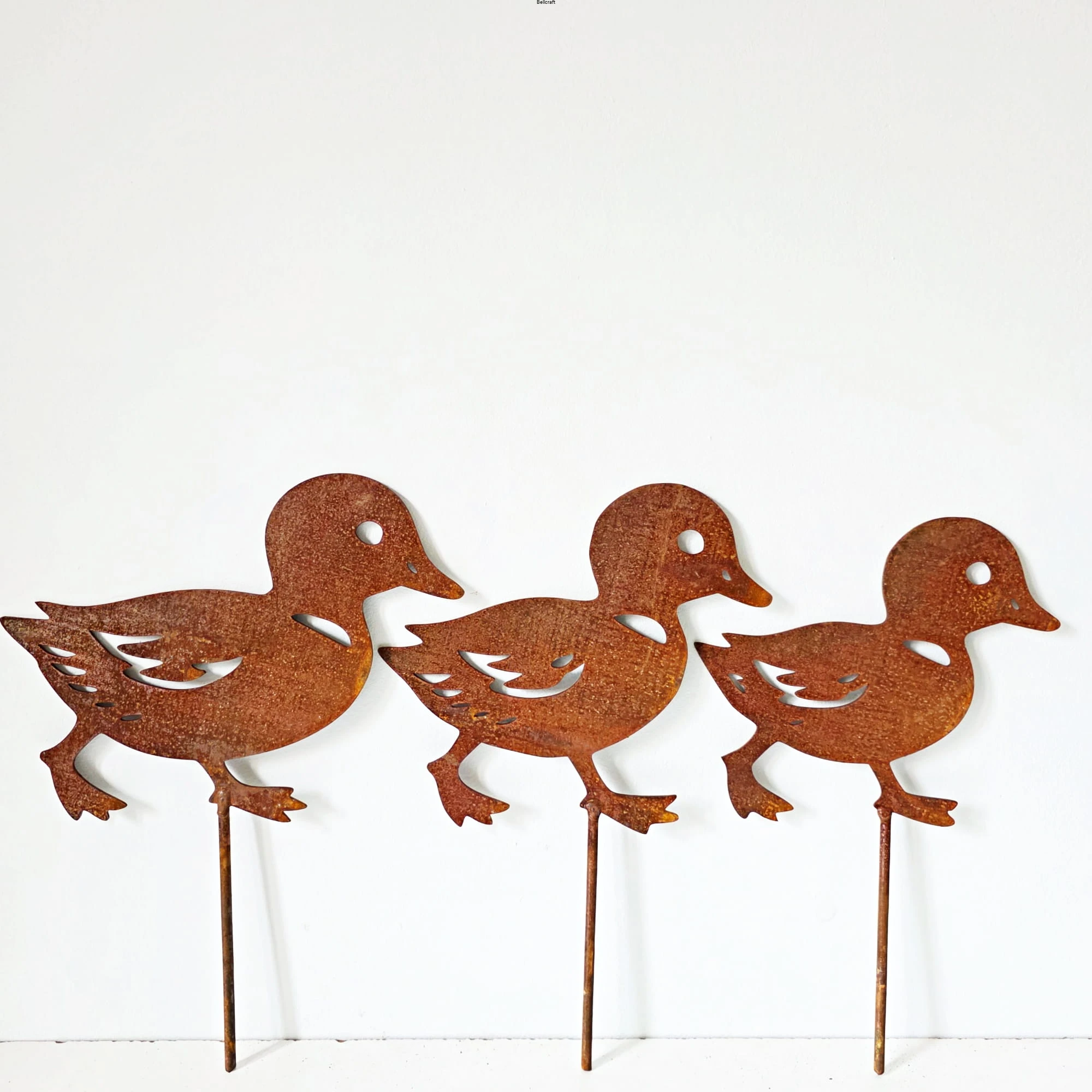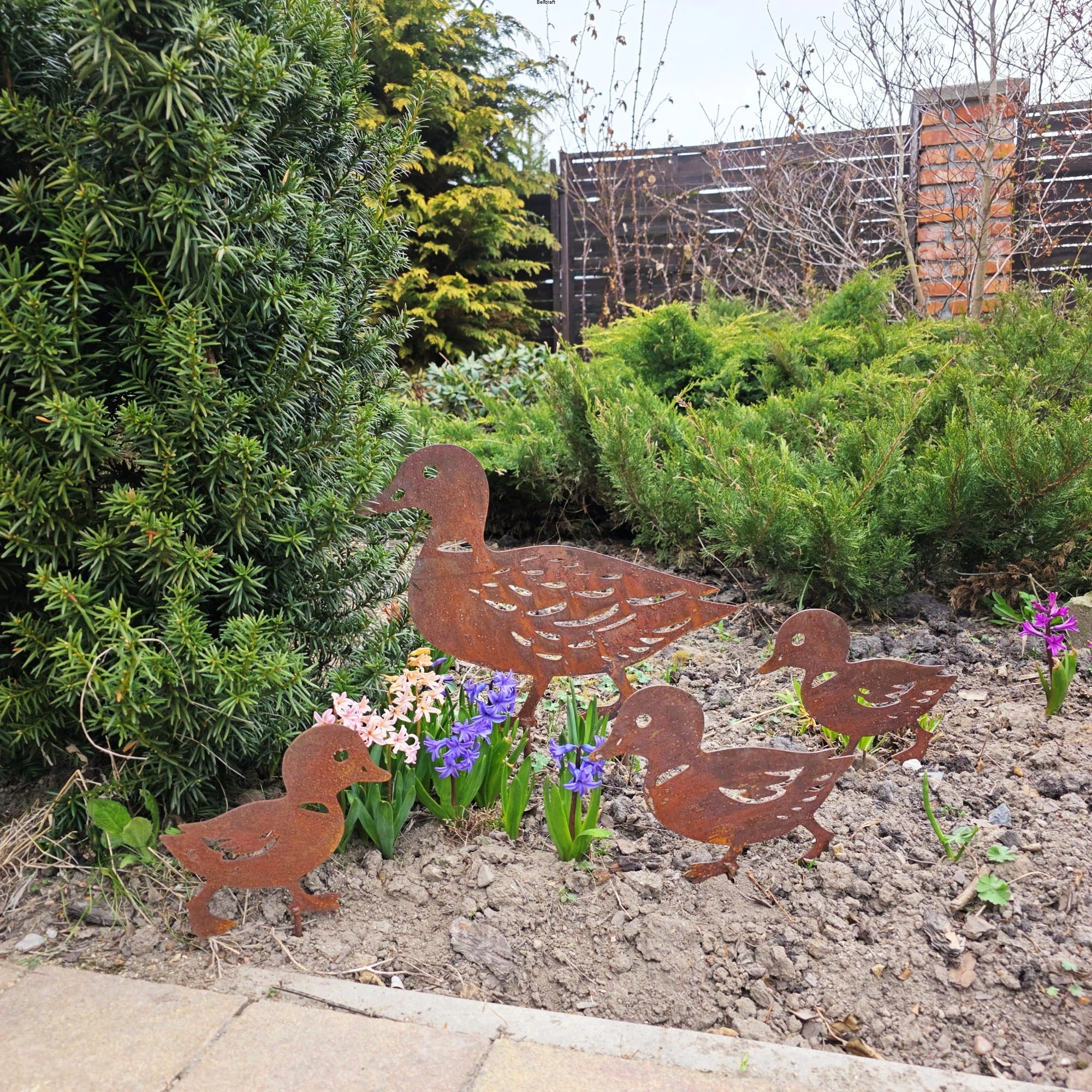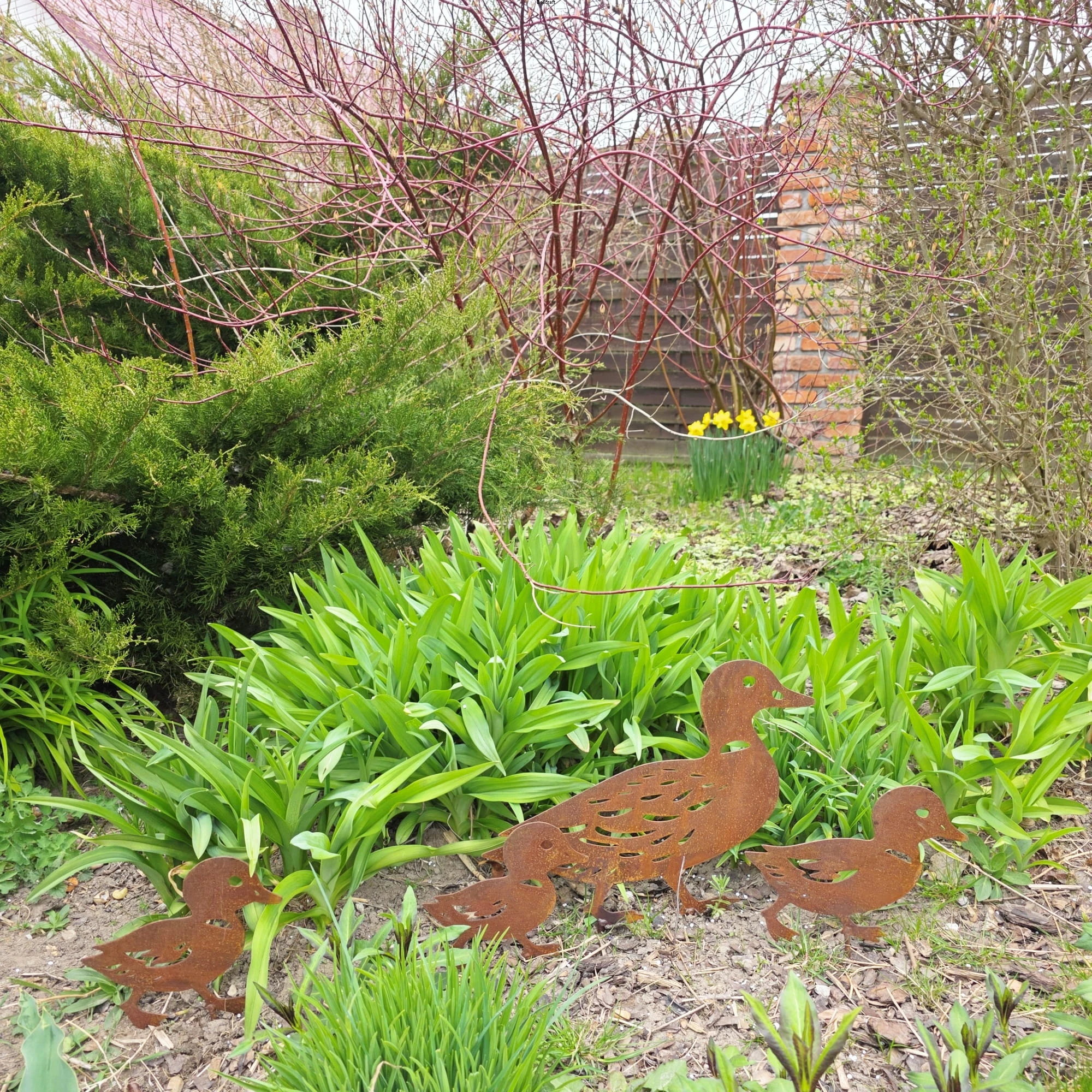 Urocza rodzinka kaczek: mama i trzy kaczuszki - to dekoracja, która wniesie do ogrodu sielski klimat. Każda kaczuszka ma nieco inny kształt i wielkość, co sprawia, że całość wygląda naturalnie i dynamicznie. Wykonane z metalu pokrytego naturalną rdzą pięknie komponują się z zielenią ogrodu, szczególnie w pobliżu niskich rabat, trawnika czy oczka wodnego.