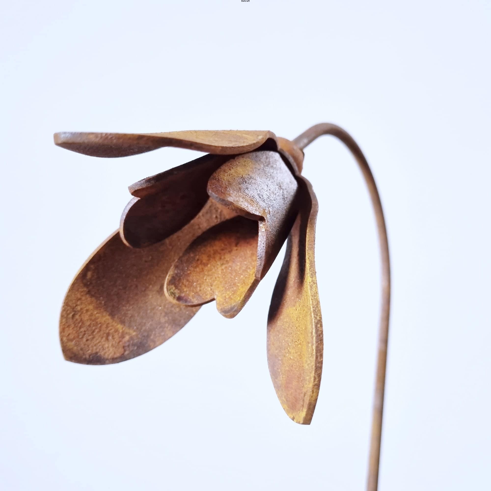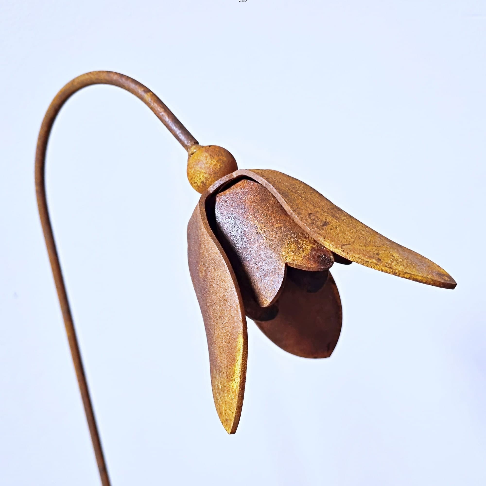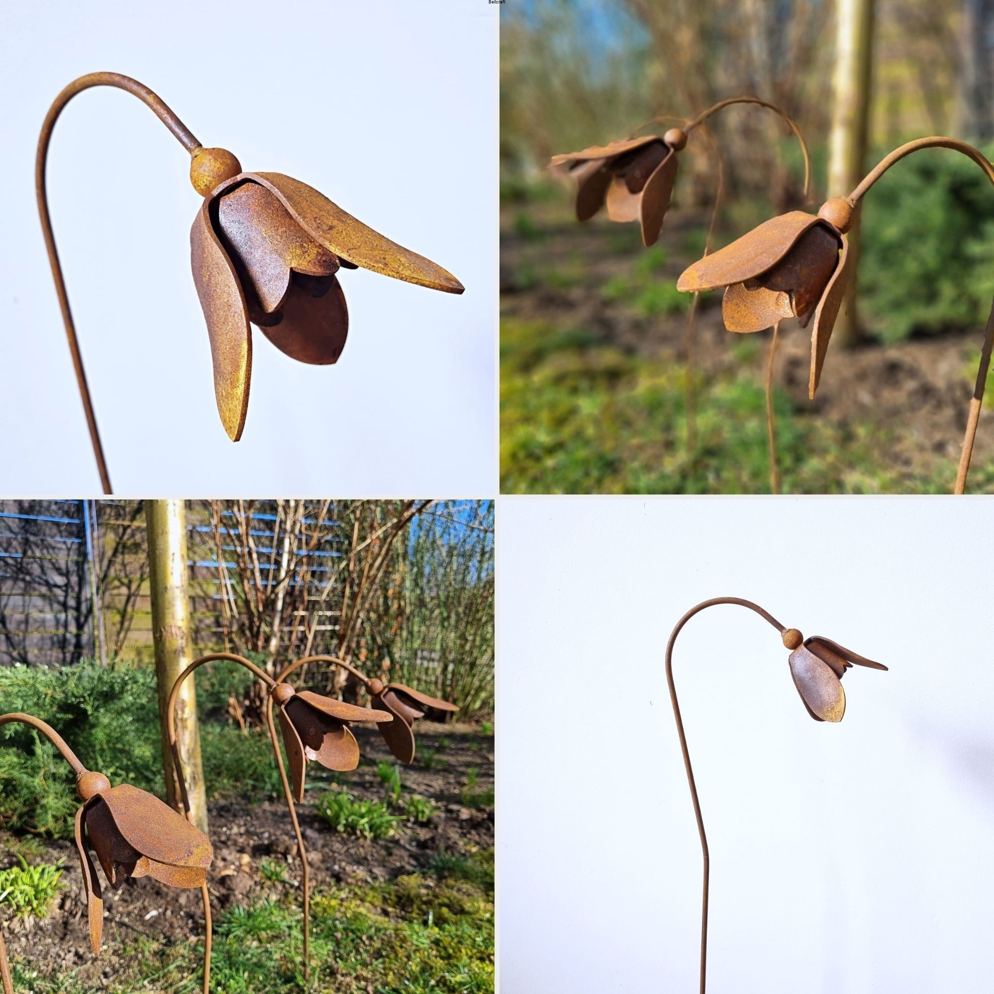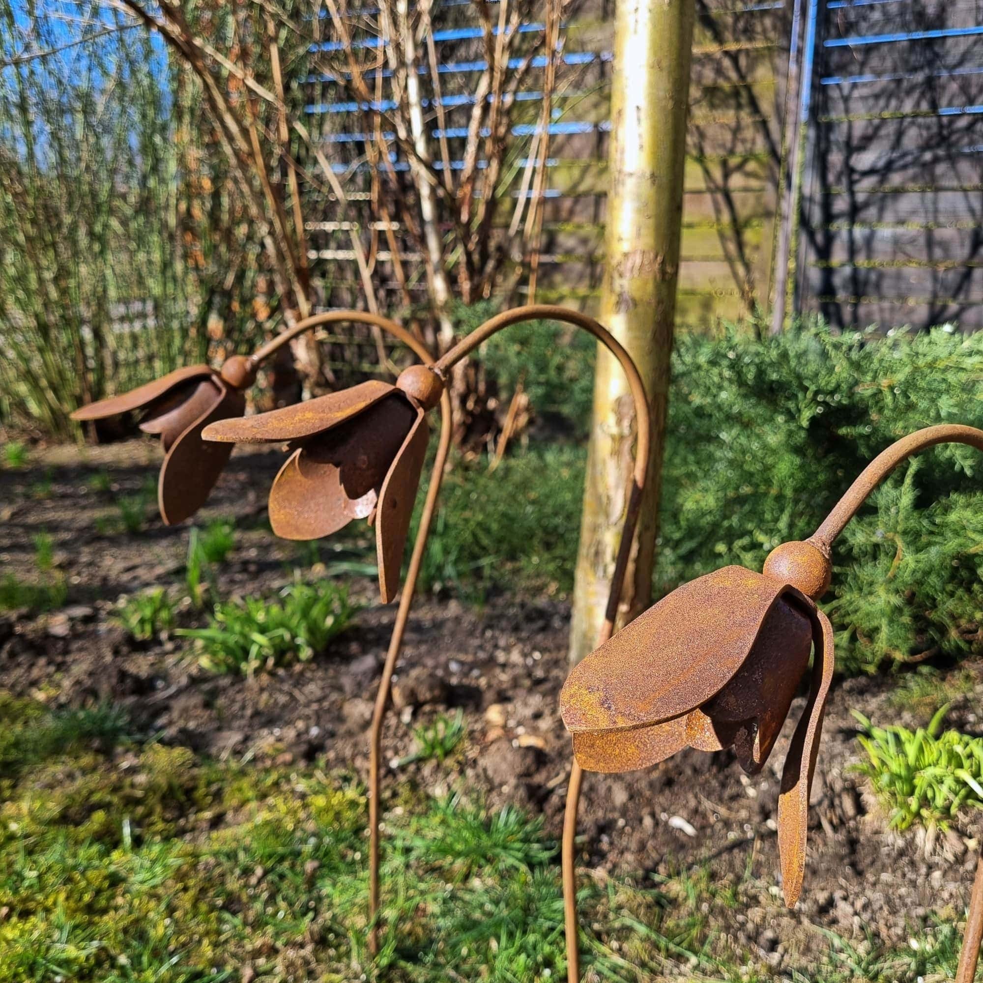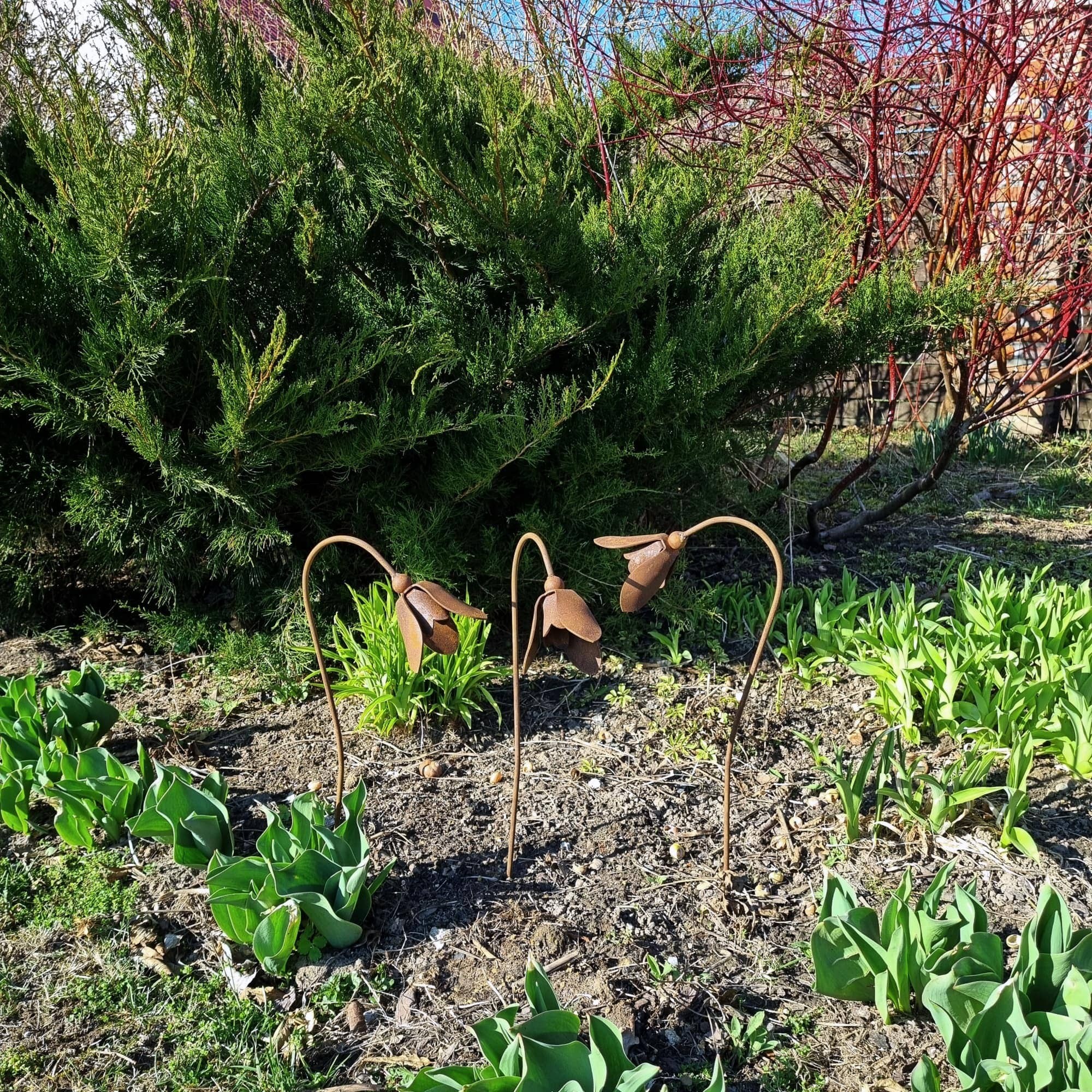 Zestaw trzech uroczych przestrzennych przebiśniegów z metalu pokrytego naturalną rdzą.