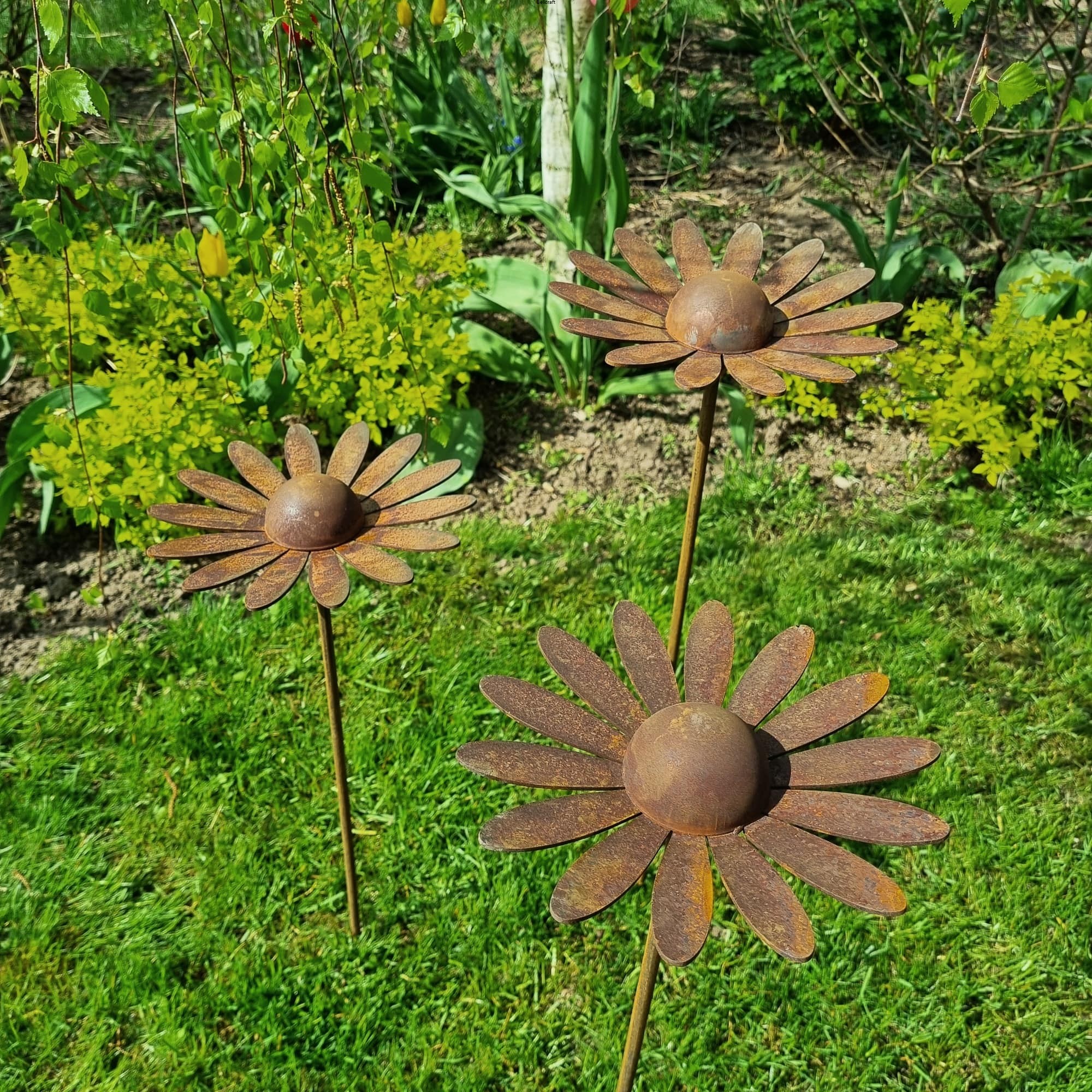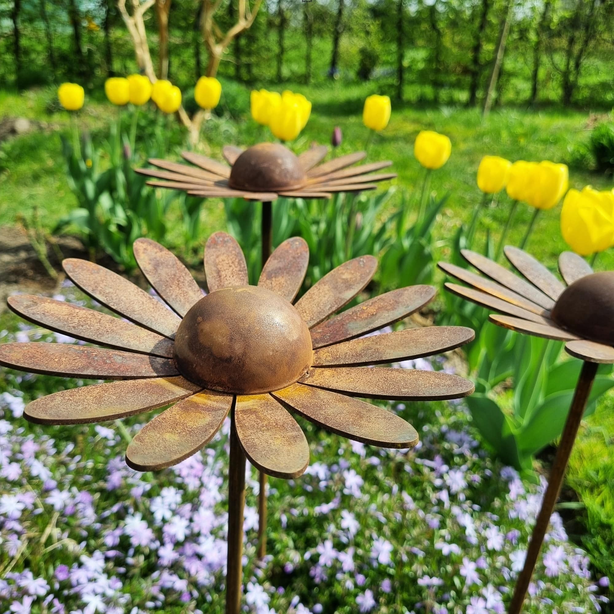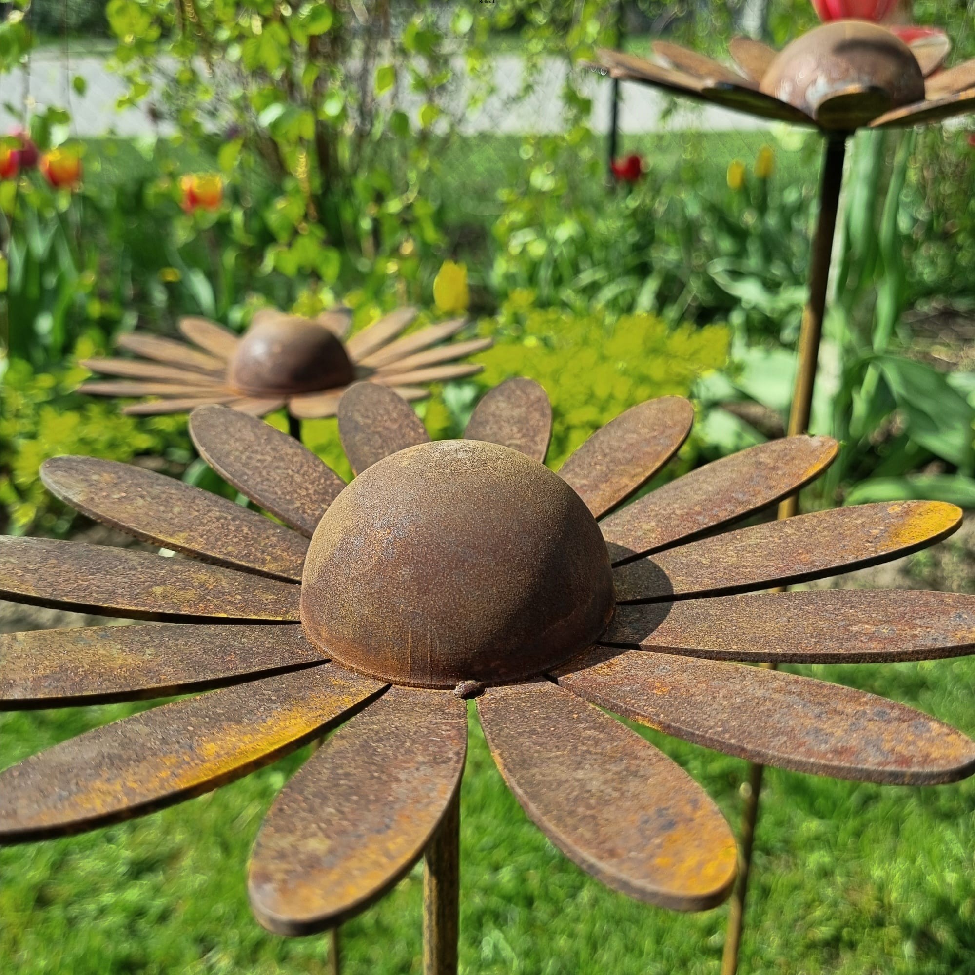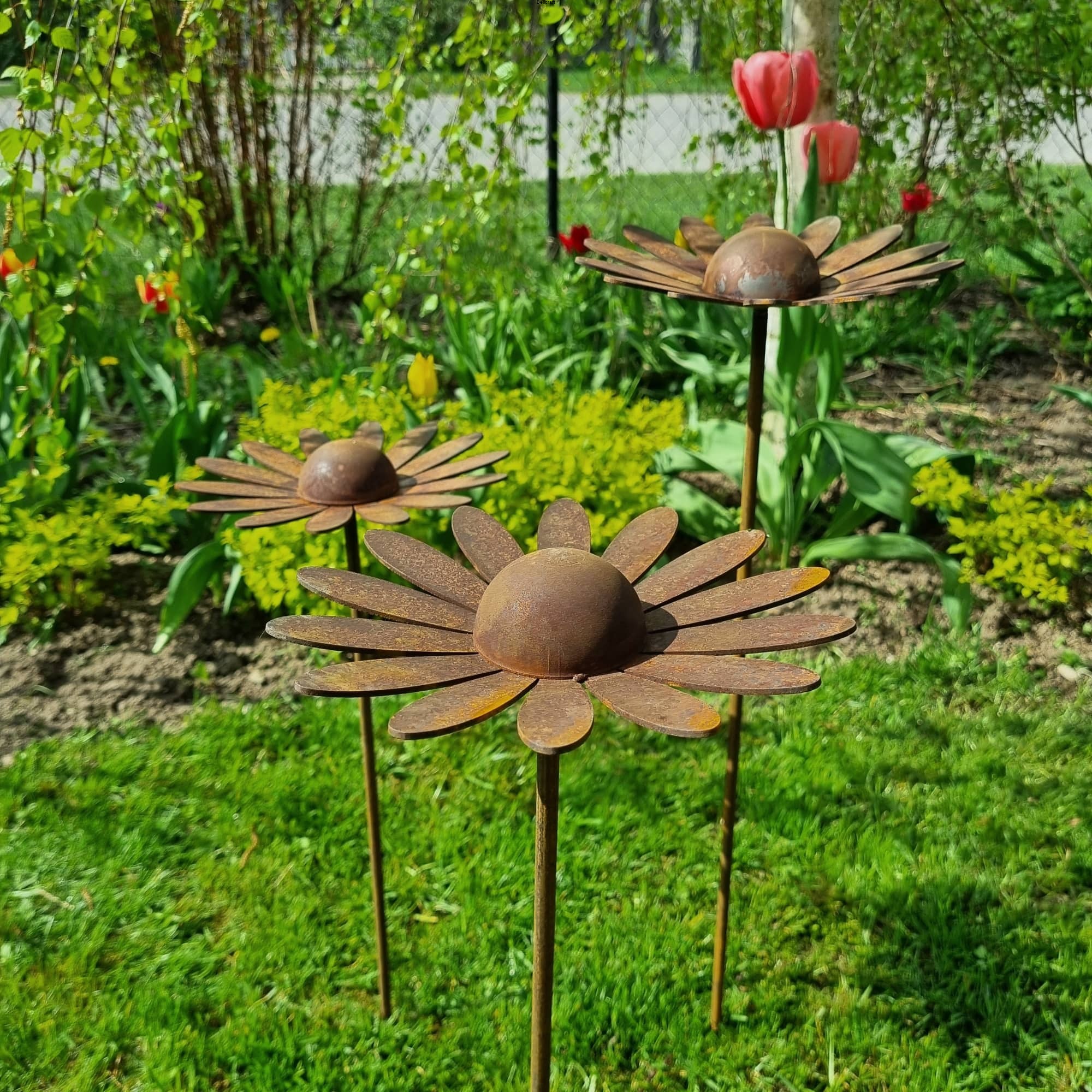 Zestaw trzech uroczych przestrzennych stokrotek z metalu pokrytego naturalną rdzą.