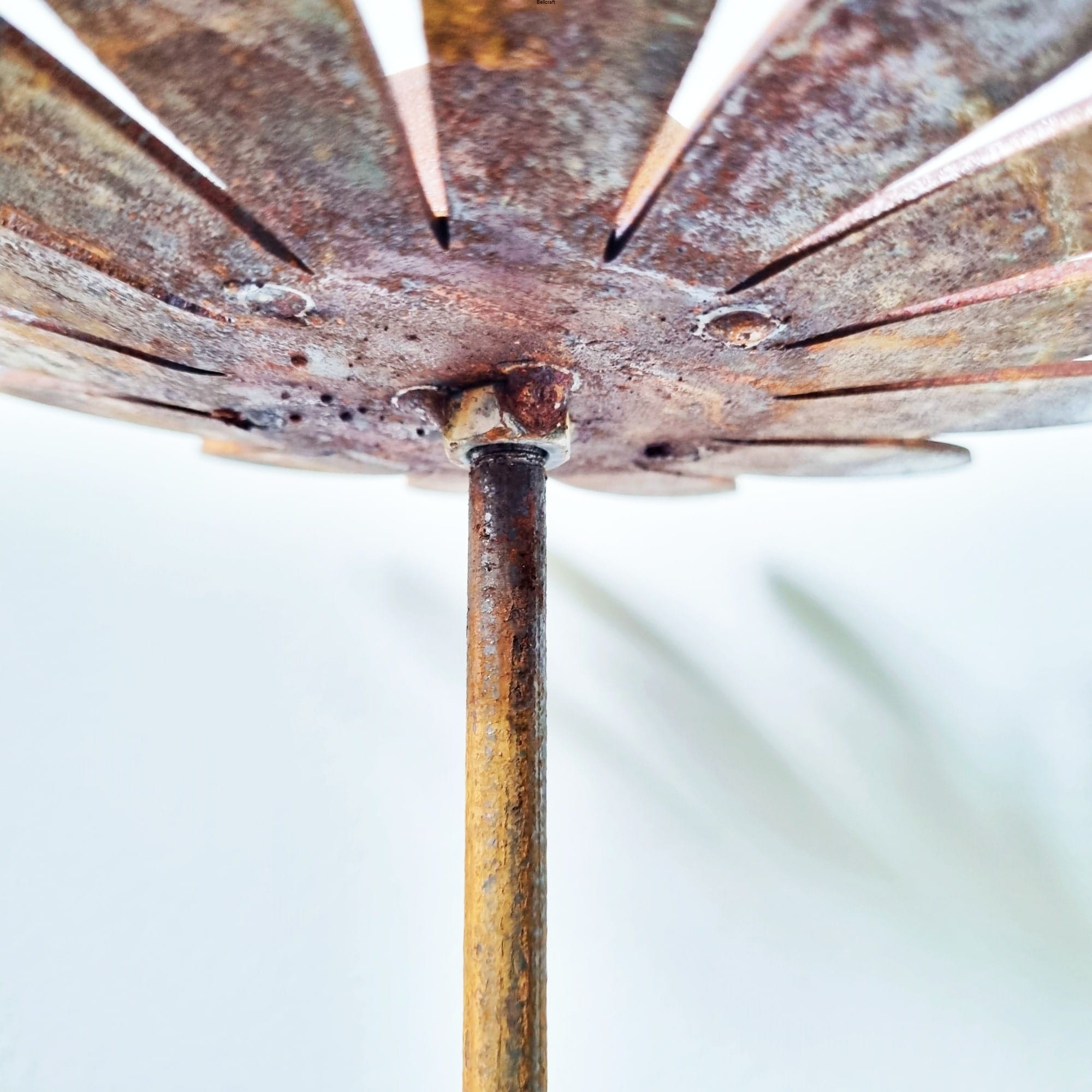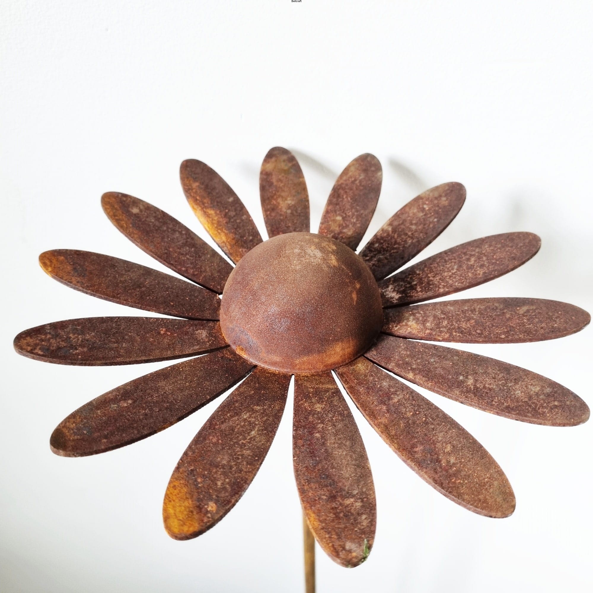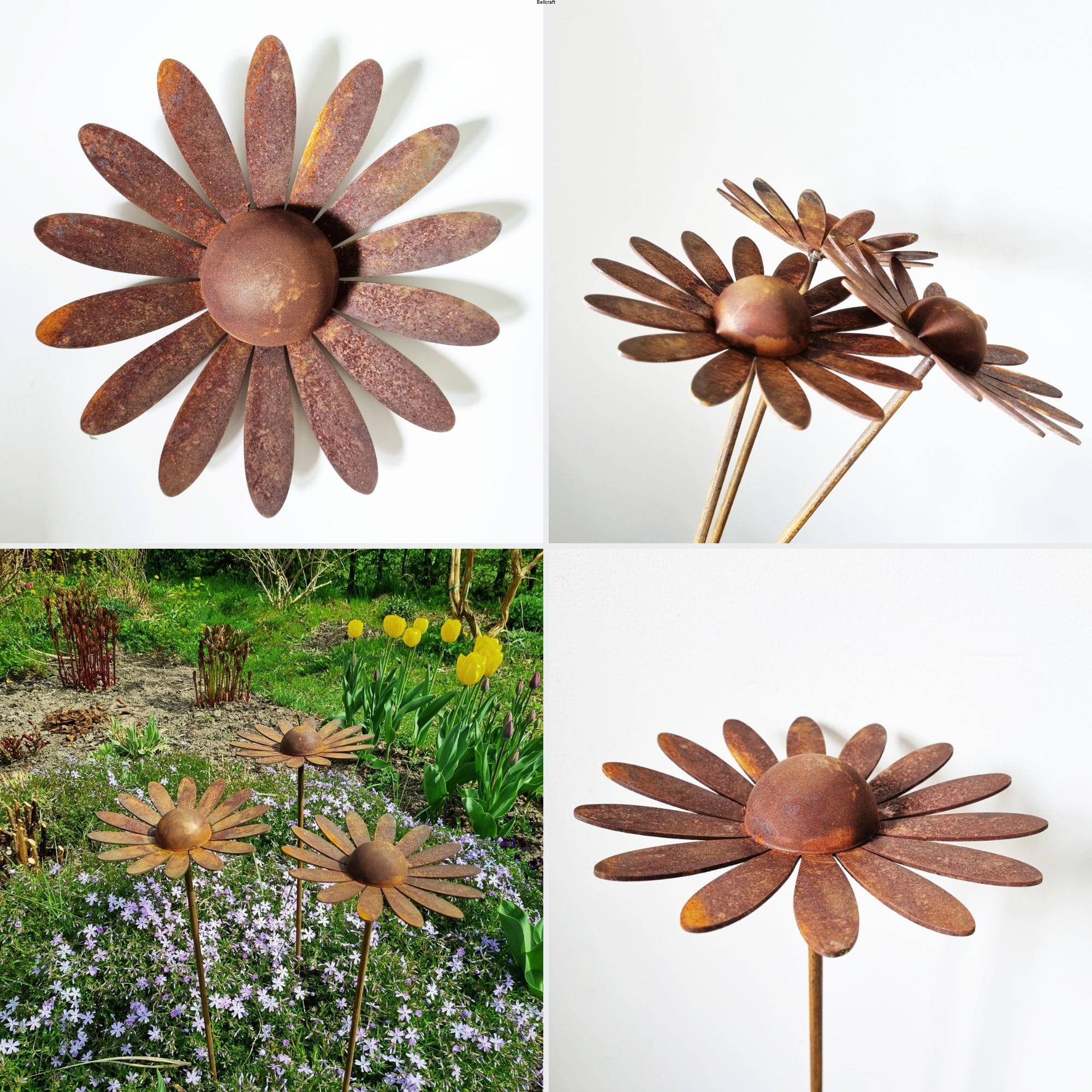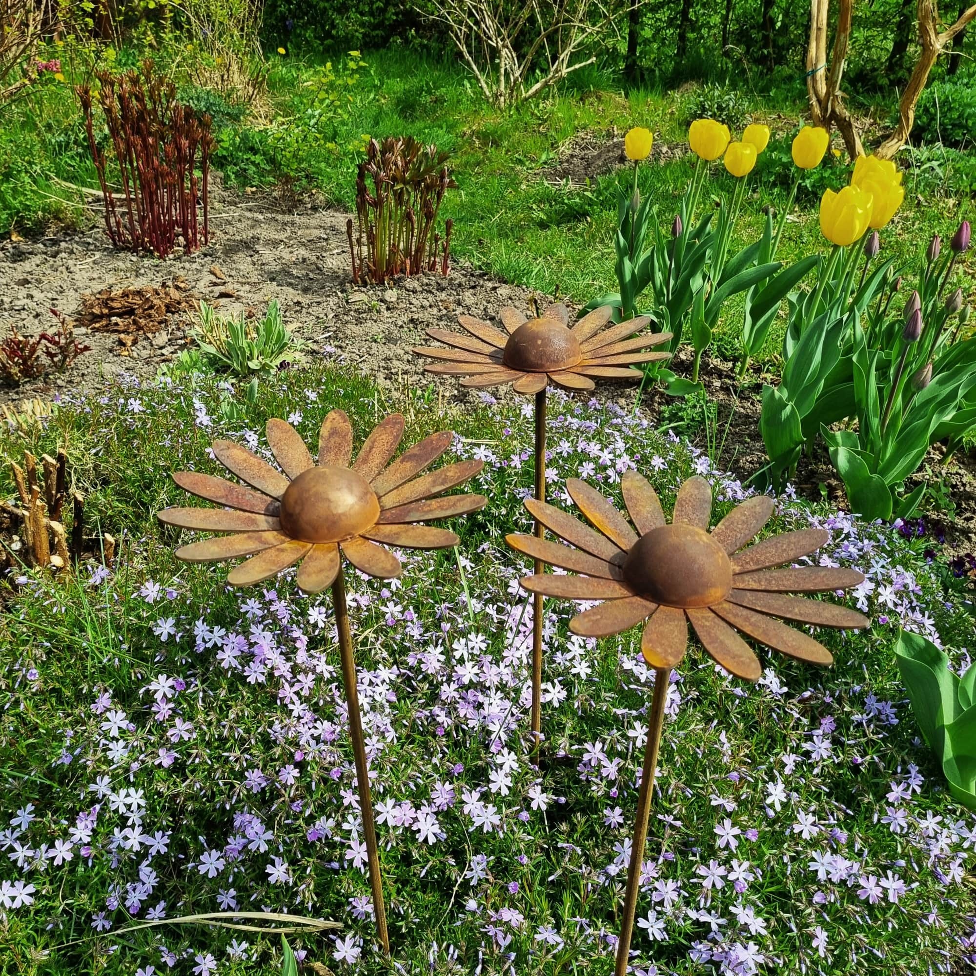 Zestaw trzech uroczych przestrzennych stokrotek z metalu pokrytego naturalną rdzą.